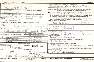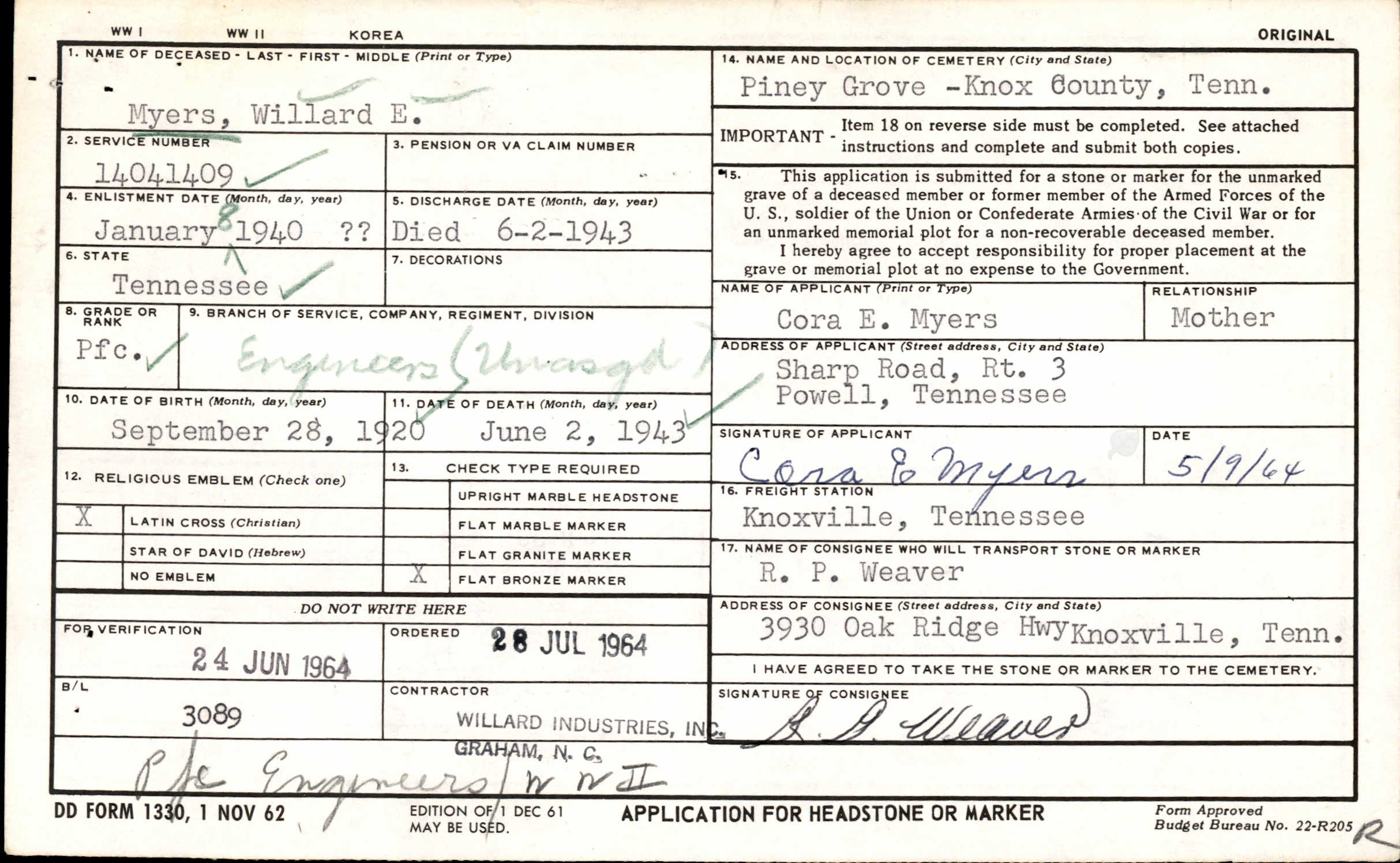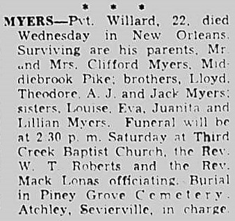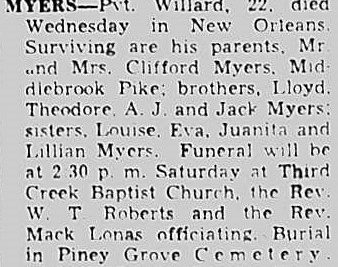 Pvt. Willard Myers, 22, died Wednesday in New Orleans. Surviving are his parents, Mr. and Mrs. Clifford Myers, Middlebrook Pike; brothers, Lloyd, Theodore, A.J. and Jack Myers; sisters, Louise, Eva, Juanita and Lillian Myers. Burial in Piney Grove Cemetery.