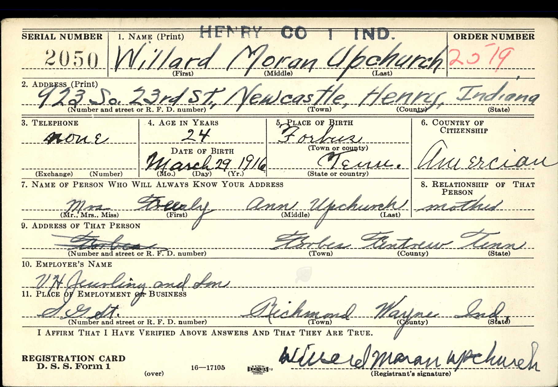 Willard Moran Upchurch was born at Forbus, Tennessee, the son of Cyrenius Raymond Gregg Upchurch and Freely Ann Crabtree. He resided at New Castle, Indiana at the time he entered the service.