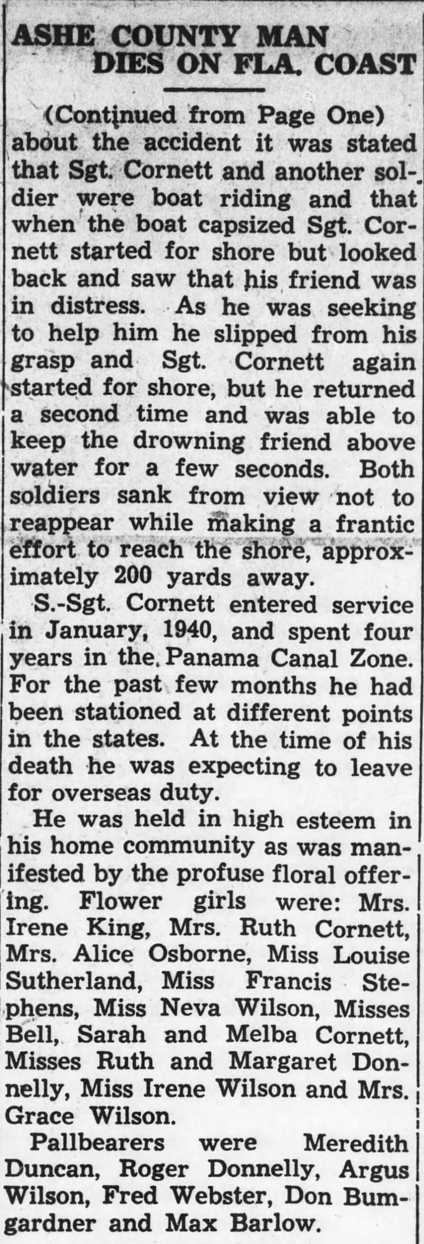 In a letter from his Major to his parents, S/Sgt Cornett was most highly commended for his ability as an outstanding member of his fighter squadron. In explaining about the accidet it was stated that Sgt. Cornett and another soldier were boatriding and that when the boat capsized Sgt. Cornett started for shore but looked back and saw that his friend was in distress. As he was seeking to help him he slipped from his grasp and Sgt Cornett again started for shore, but he returned a second time and was able to keep the drowning friend abot water for a few seconds. Both soldiers sank from view not to reappear while making a frantic effort to reach the shore, approximately 200 yards away. S/Sgt. Cornett entered service in January, 1940, and spent four years in the Panama Canal Zone. For the past few months he had been stationed at different points in the states. At the time of his death he was expecting to leave for overseas duty. He was held in high esteem in his home community as was manifested by the profuse floral offering.