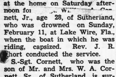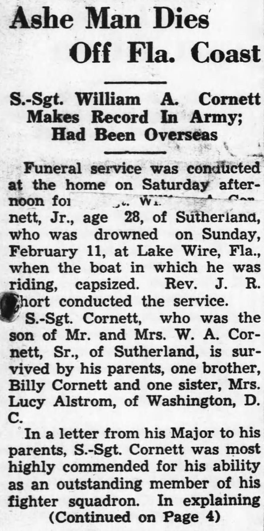 S-Sgt. William A. Cornett Jr., drowned at Lake Wire, Fla. when the boat in which he was riding, capsized. He is survived by his parents, Mr. and Mrs. W.A. Cornett Sr., of Sutherland, one brother, Billy Cornett and one sister, Mrs. Lucy Alstrom, of Washington, D.C.