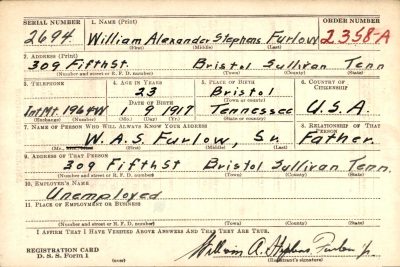 William Alexander Stephens “Billy Furlow was born at Bristol, Tennessee. Lt. Furlow graduated from Bristol, Tenn., High School, class of 1937, after distinguishing himself in football, basketball and other athletics. He was a member of the 1936-1967 basketball team. Entering service before war was declared, young Furlow received training at Camp Lee, Va., and Langley Field, Va., and was sent to the Pacific war theatre early in August, 1943.