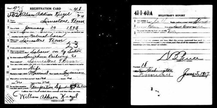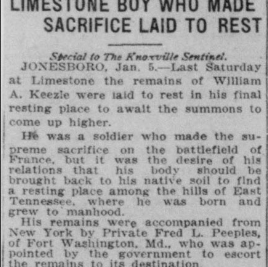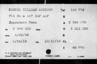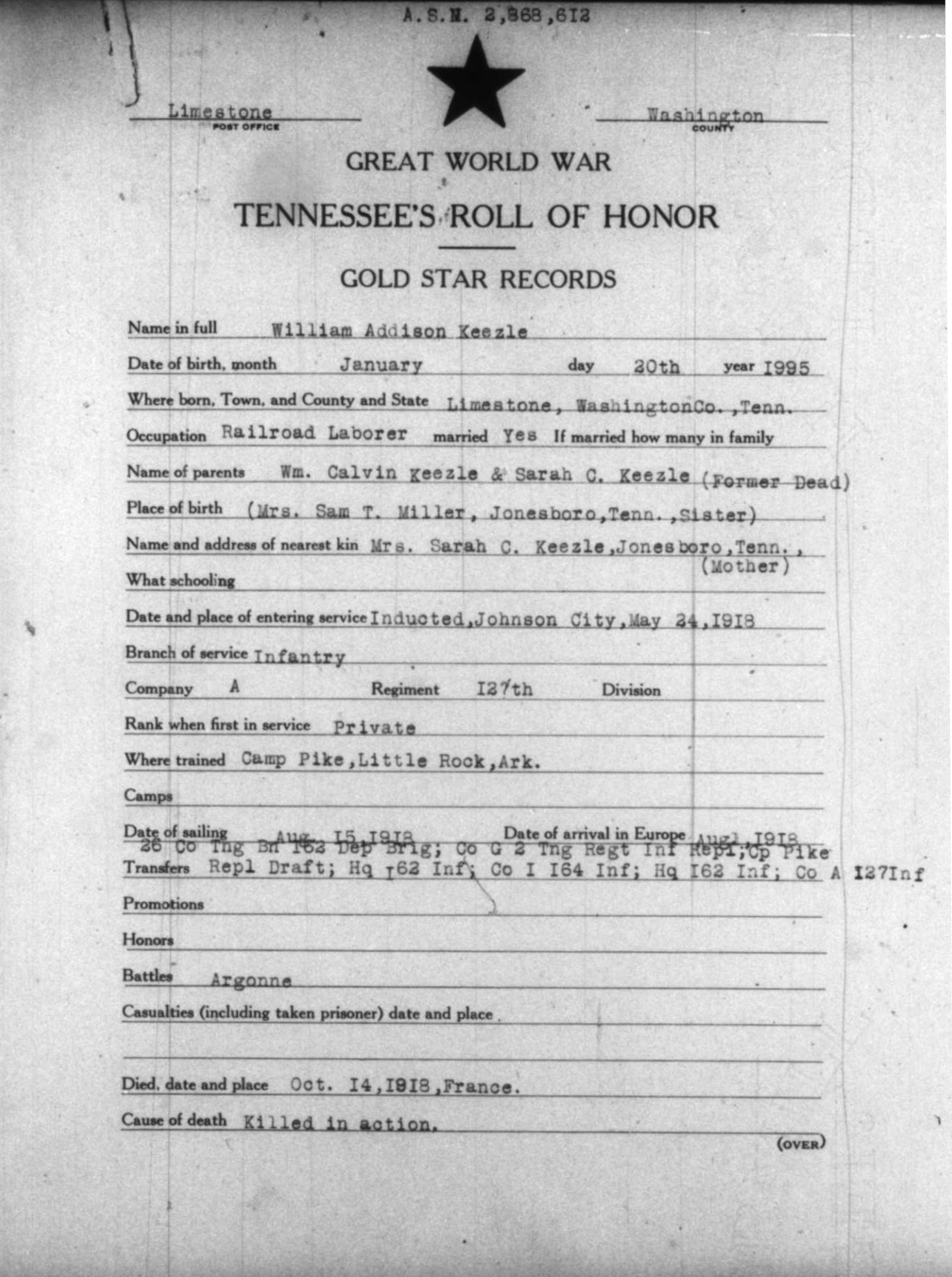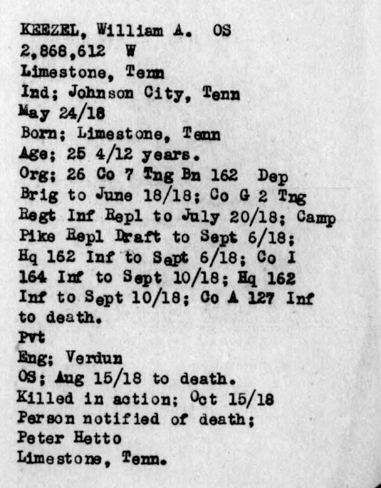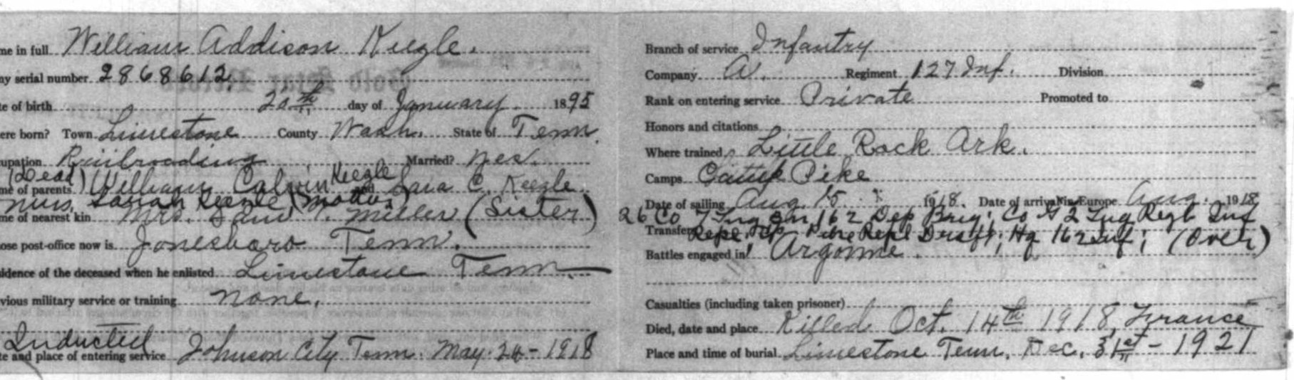 William was born in Limestone, Washington County, Tennessee on 20 January 1895. He worked as a Section Laborer in the Limestone area for the Southern Railway Company prior to enlisting in the United States Army. William enlisted on 24 May 1918 in Johnson City and was dispatched to Camp Pike, Little Rock, Arkansas for boot camp. Once there he was assigned to Company 26, 7th Training Battalion and afterwards to Company G, 2nd Training Regiment Infantry Replacement Draft.