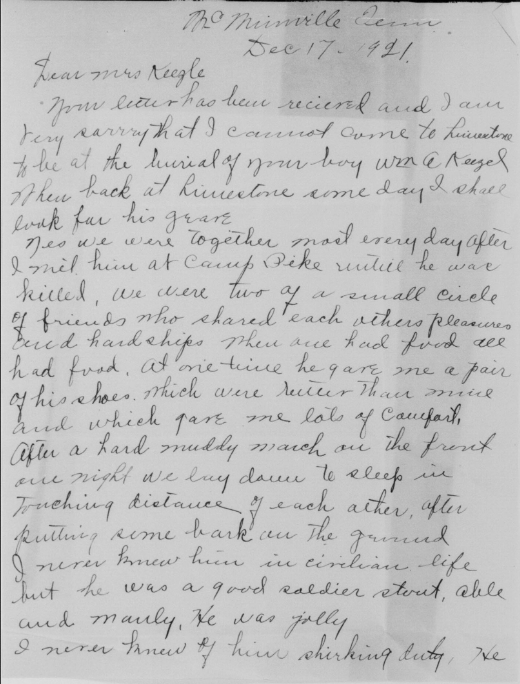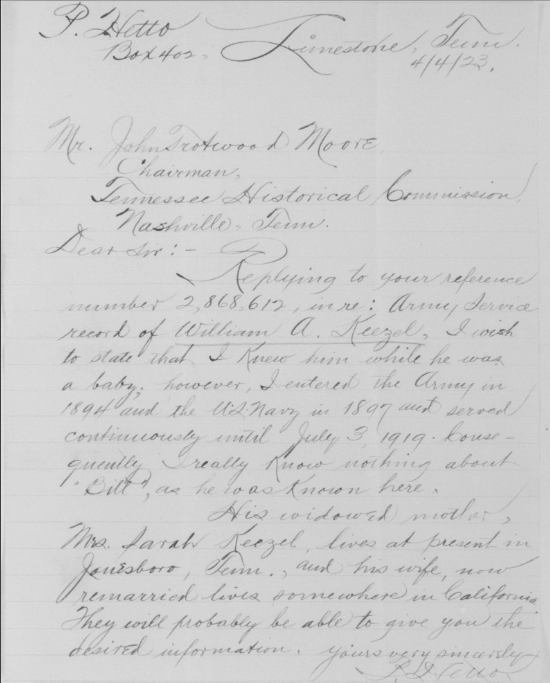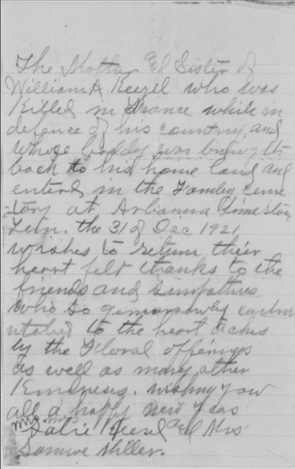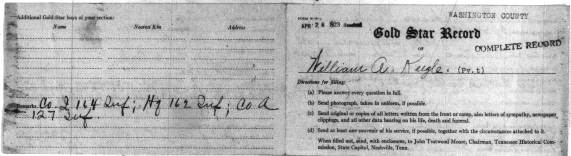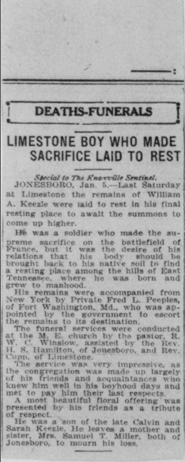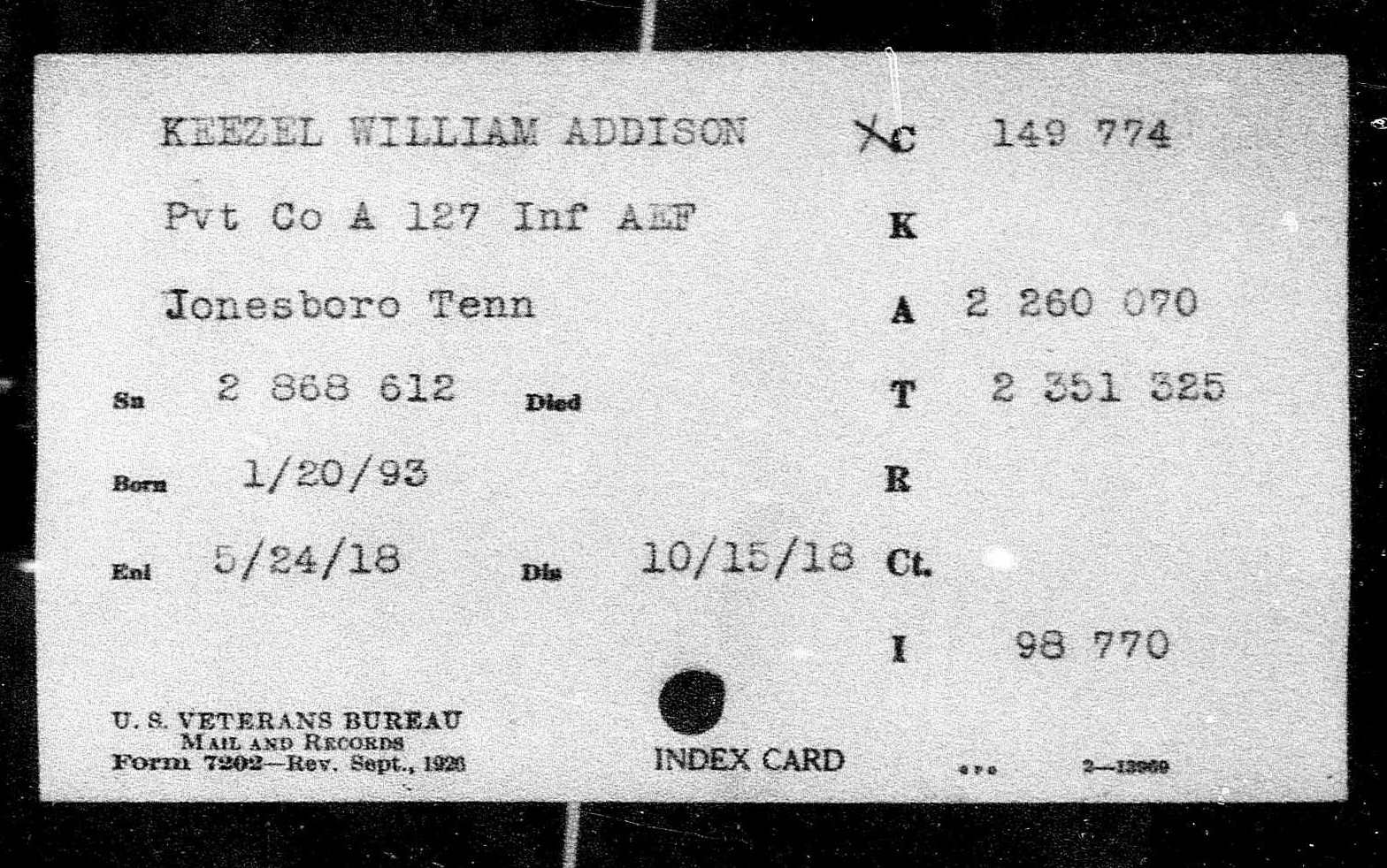 William was born in Limestone, Washington County, Tennessee on 20 January 1895. He worked as a Section Laborer in the Limestone area for the Southern Railway Company prior to enlisting in the United States Army. William enlisted on 24 May 1918 in Johnson City and was dispatched to Camp Pike, Little Rock, Arkansas for boot camp. Once there he was assigned to Company 26, 7th Training Battalion and afterwards to Company G, 2nd Training Regiment Infantry Replacement Draft.