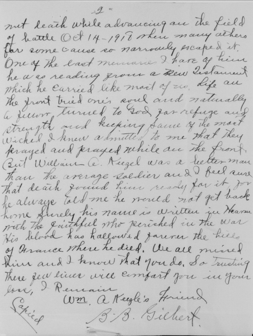 The 32nd was preparing for the Meuse-Argonne Offensive that was getting ready to kick-off on 26 September 1918. Their task was to break through the Kriemhilde Stellung known as the strongest position on the whole Hindenburg Line, located between Romagne to the northeast and Gesnes to the south. This operation began on 30 September for William at a village named Cierges and ended for him on 15 October when he was killed in action at a frowning hill (Hill 287) nicknamed La Côte Dame Marie. The day after the 32nd breached the line. William’s gallantry in action ensured that breach held after helping take that German fortified heights. He was 23 years old and is interred at the Urbana Cemetery at Limestone, Tennessee in Section D, Row 12, Grave 4.