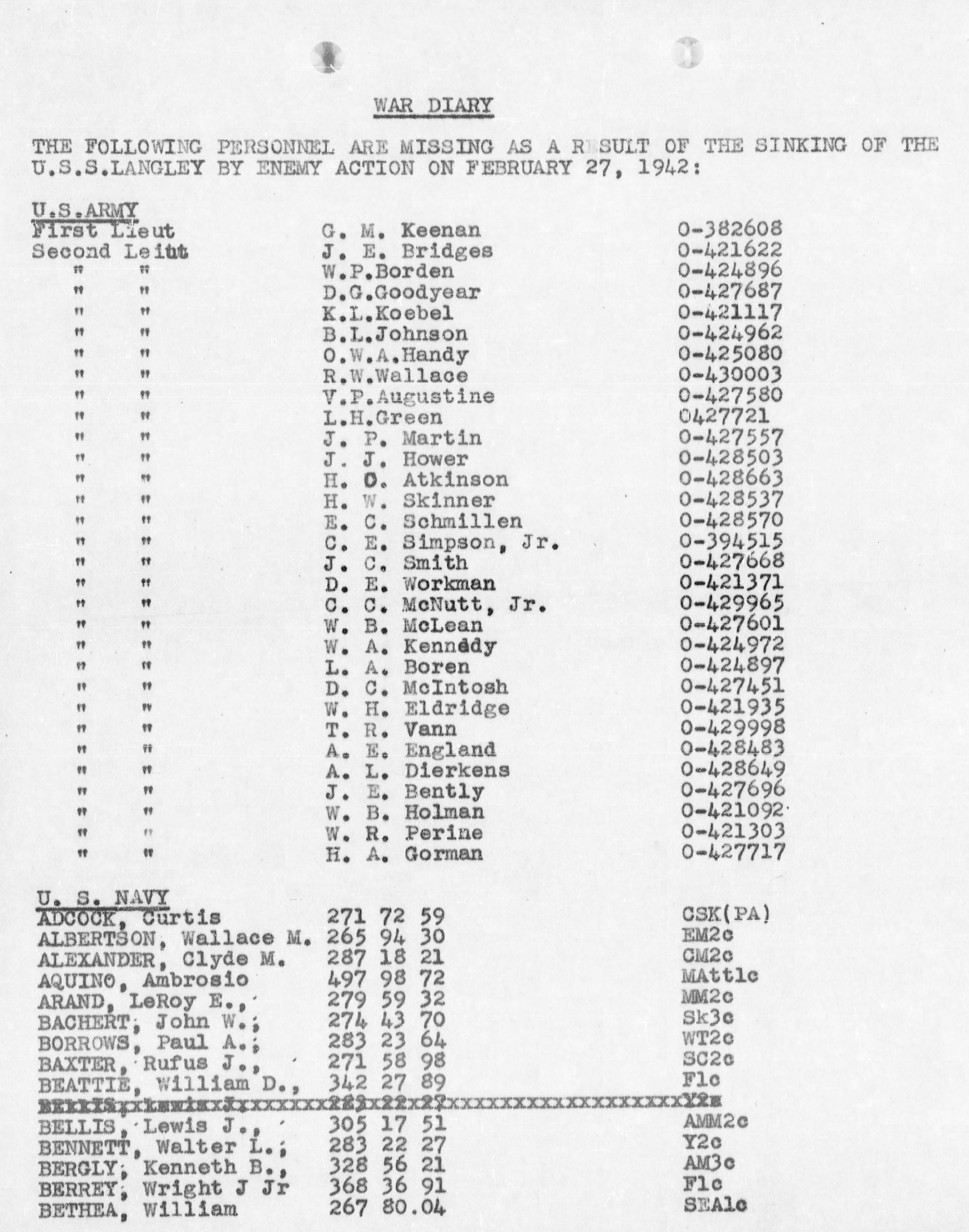 1st L William Kennedy went missing as a result of the sinking of the U.S.S. Langley by enemy action on 27 February 1942. He is memorialized at Manila American Cemetery in Fort Bonifacio, Manila, Philippines