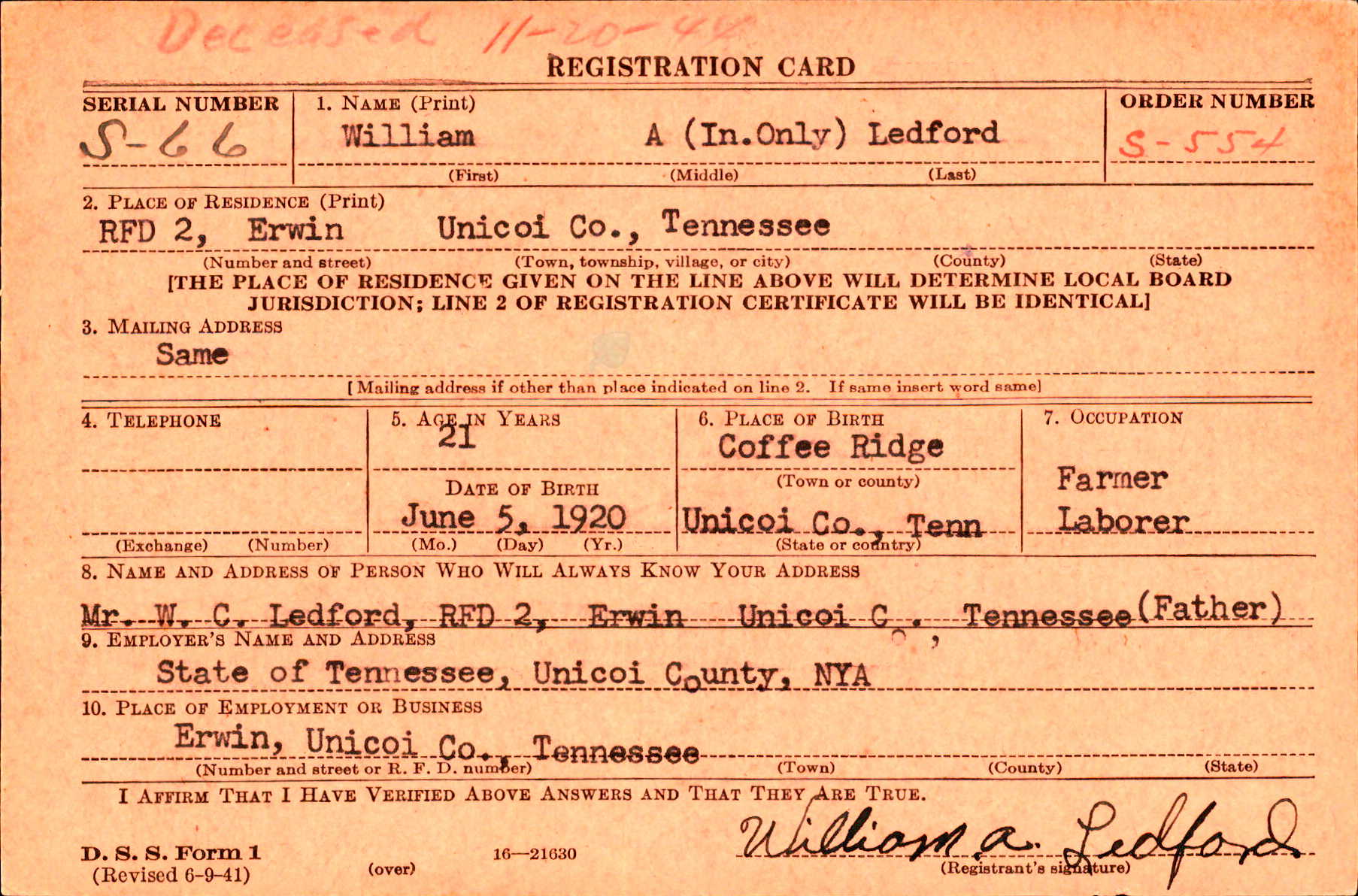 Arthur Ledford was born in Coffee Ridge, Tennessee. He was the son of William Cornelius Ledford and Maria Fender. He married Mildred Louise Taylor on 7 april 1944.