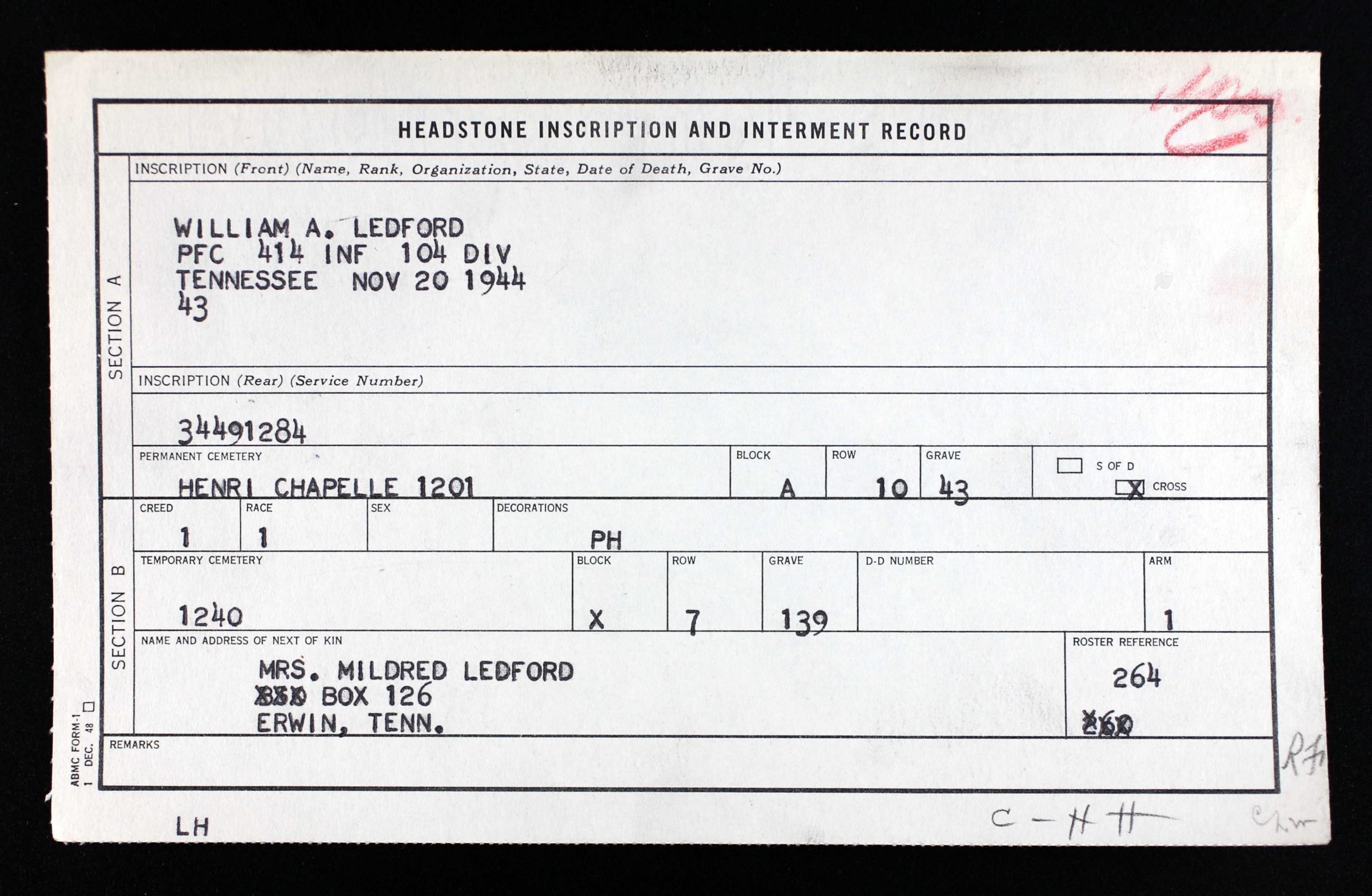 Buried at Henri-Chapelle American Cemetery, Belgium, A, 10, 43. He is memorialized at Ledford Cemetery in Coffee Ridge, Unicoi County, Tennessee.