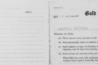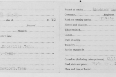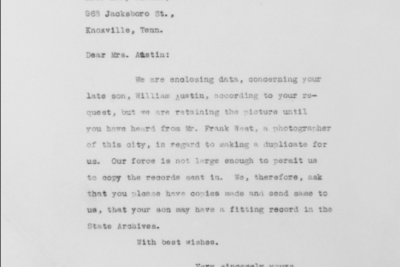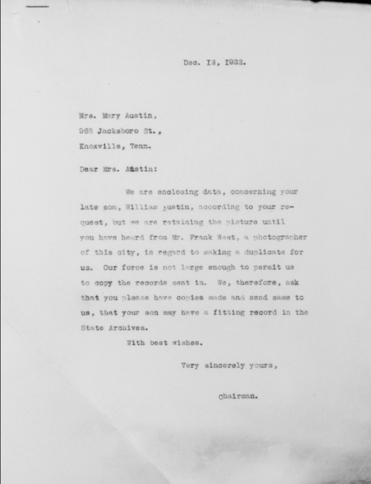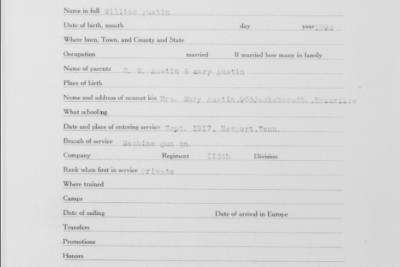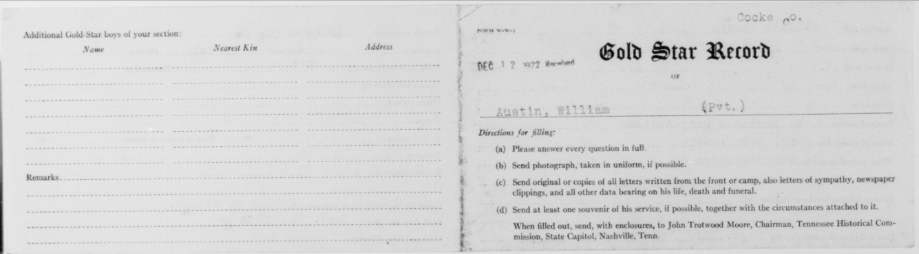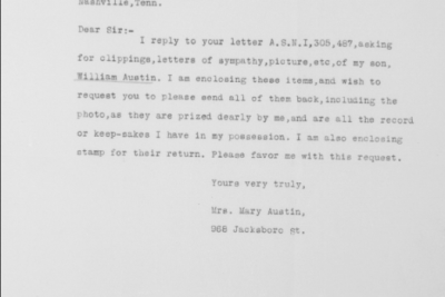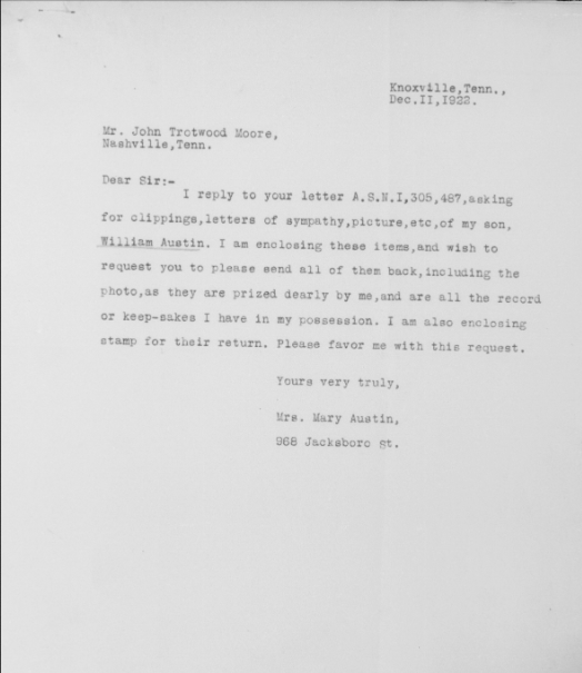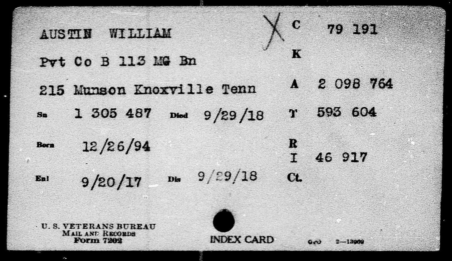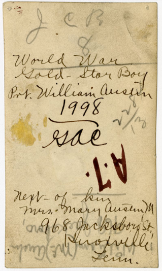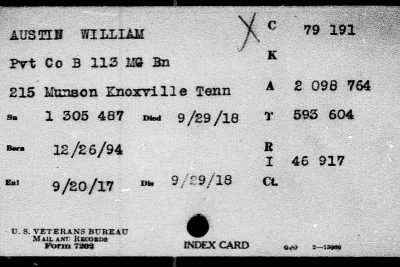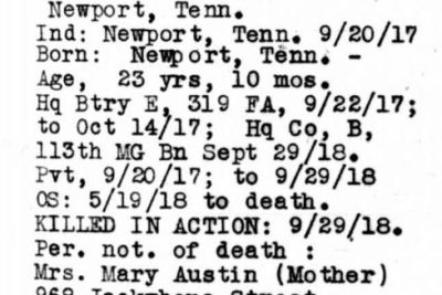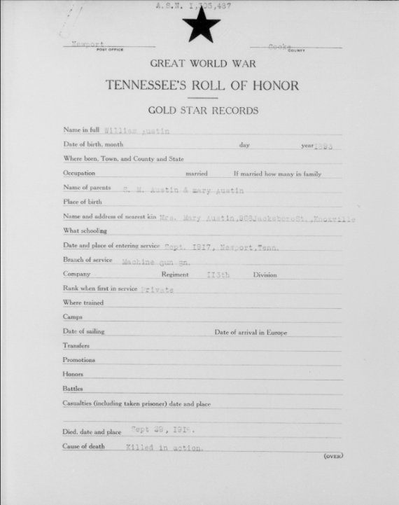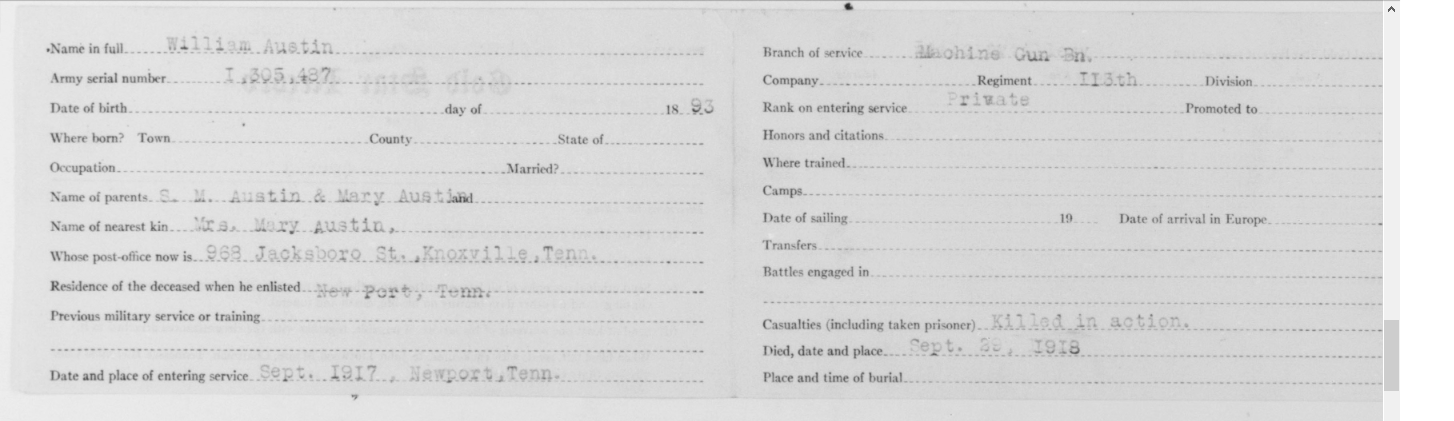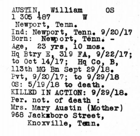 Private William Austin, one of the last men to be reported killed, formerly resided with his mother, Mrs. Mary Austin, 968 Jacksboro Street. Mrs. Austin received an official telegram from the war department last Friday, announcing the death of her son. Private Austin lived at Newport, Tenn, before the family moved to Knoxville. He resided here for a few years before entering the army. He was a member of the 113th regiment and was sent to France with that command.