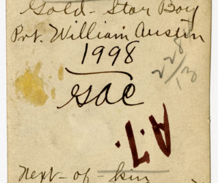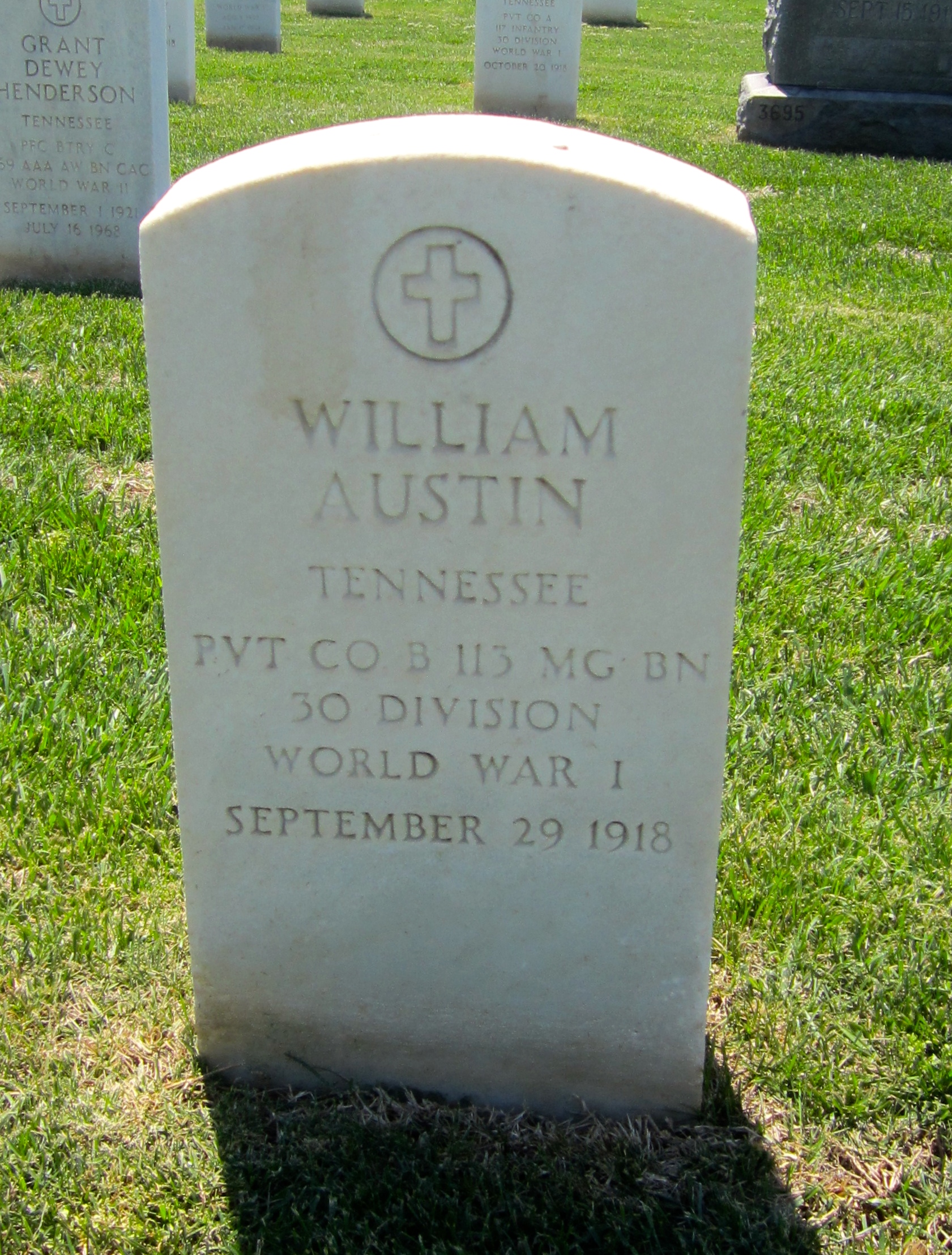 William M. Austin enlisted September 15, 1917, as a member of Company B, 113th Machine Gun Battalion, 30th Division. After training at Camp Sevier, SC, he went to France in May 1918, with his division. He took part in the fighting in Belgium, but was killed in action September 29, 1918, on the first day of the attack on the Hindenburg Line. He died at the age of 23.