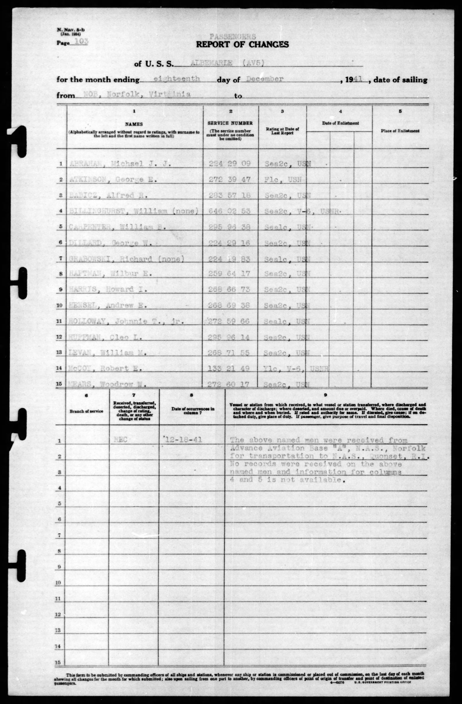 He served on the Advance Aviation Base “A” N.A.S., Norfolk, VA, in 1941 and was transferred from the Motor Torpedo Boat Training Center at Portsmouth, RI, to the U.S.S. Motor Torpedo Boats Squadron Six on 24 August 1942.