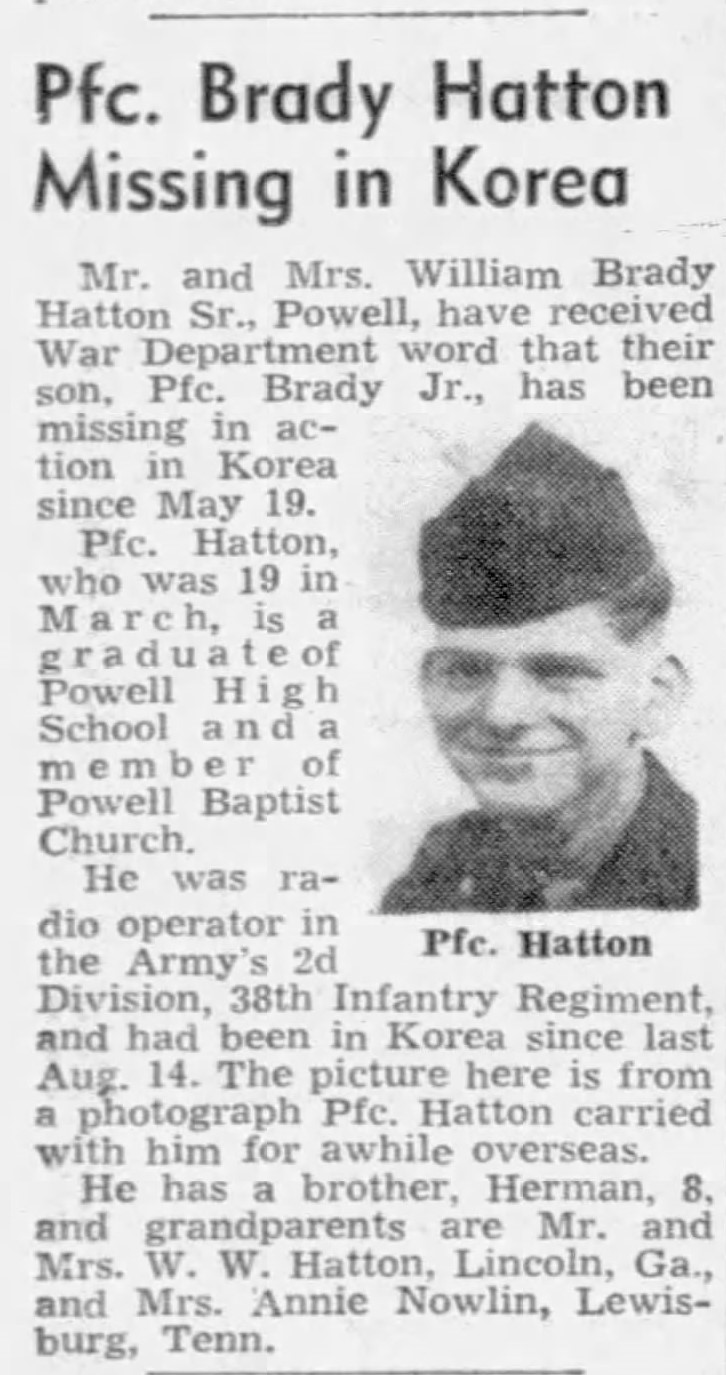 Mr. and Mrs. William Brady Hatton Sr., Powell, have received War Department word that their son, Pfc. Brady Jr., has been missing in Korea since May 19. Pfc. Hatton, who was 19 in March, is a graduate of Powell High School and a member of Powell Baptist Church. He was a radio operator in the Army’s 2nd Division, 38th Infantry Regiment, and had been in Korea since last Aug. 14. The picture here is from a camera Pfc. Hatton carried with him for awhile overseas. He has a brother, Herman, 8, and grandparents are Mr. and Mrs. W.W. Hatton, Lincoln, Ga., and Mrs. Annie Nowlin, Lewisburg, Tenn.