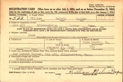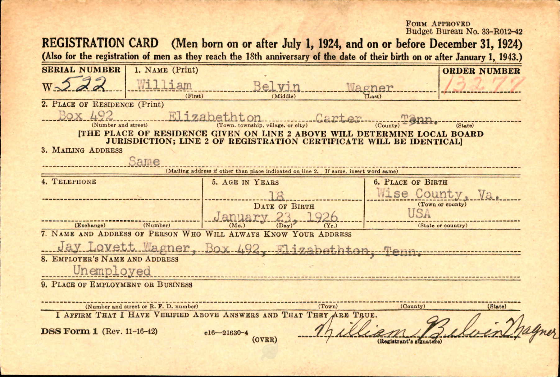 William Belvin Wagner was born on 23 January 1926, the son of Jay Lovett Wagner and Lillie Belle Greer.