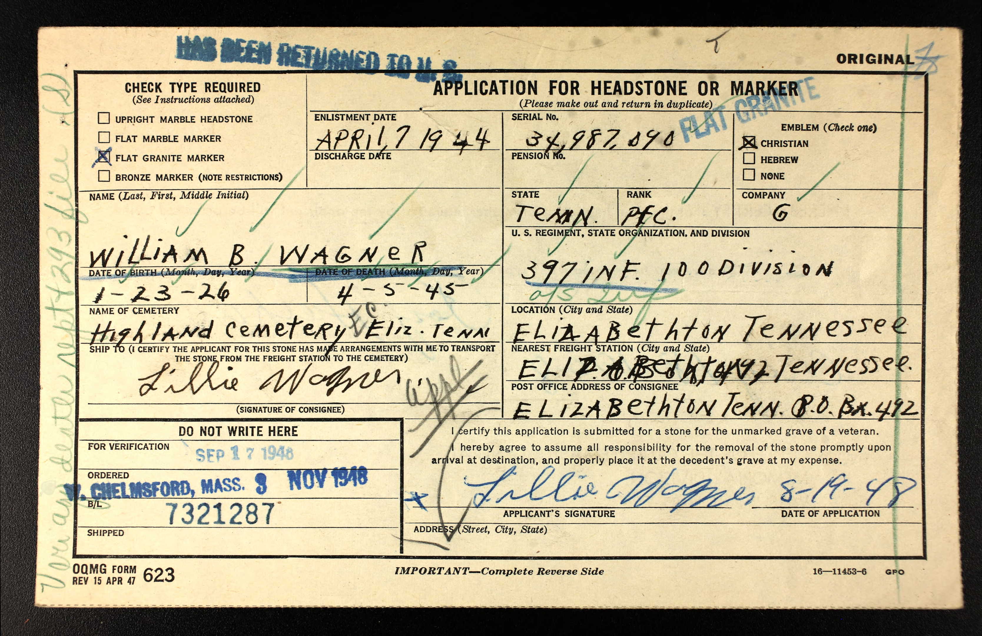 Wagner entered service April 4, 1944 and took training at Camp Wheeler, Ga. He was sent to the European Theater of Operations October 17, 1944 and died of wounds received in Germany April 5, 1945. He was awarded the Silver Star medal and the Purple Heart Medal. Prior to entering service, Wagner was employed at a local Construction company. He attended South Side School.