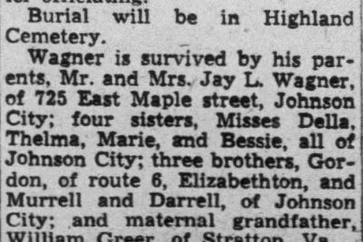 Wagner is survived by his parents, Mr. and Mrs. Jay L. Wagner, of 725 East Maple Street, Johnson City; foru sister, Misses Della, Thelma, Marie and Bessie, all of Johnson City; three brothers, Gordon, of route 6, Elizabethton, and Murrell and Darrell, of Johnson City; and maternal grandfather, William Greer of Stratton, Va.
