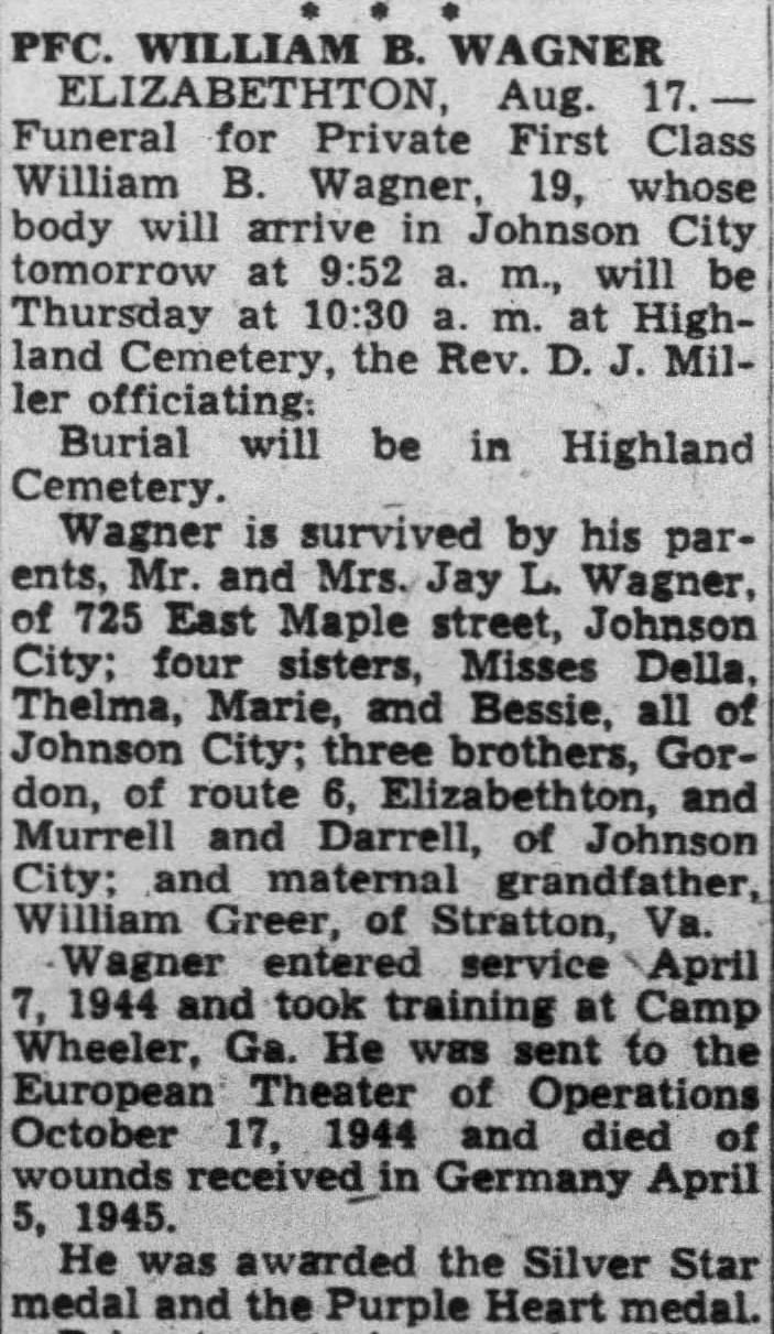 Funeral for Private First Class William B. Wagner, 19, whose body will arrive in Johnson City tomorrow will be at Highland Cemetery.