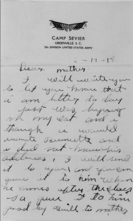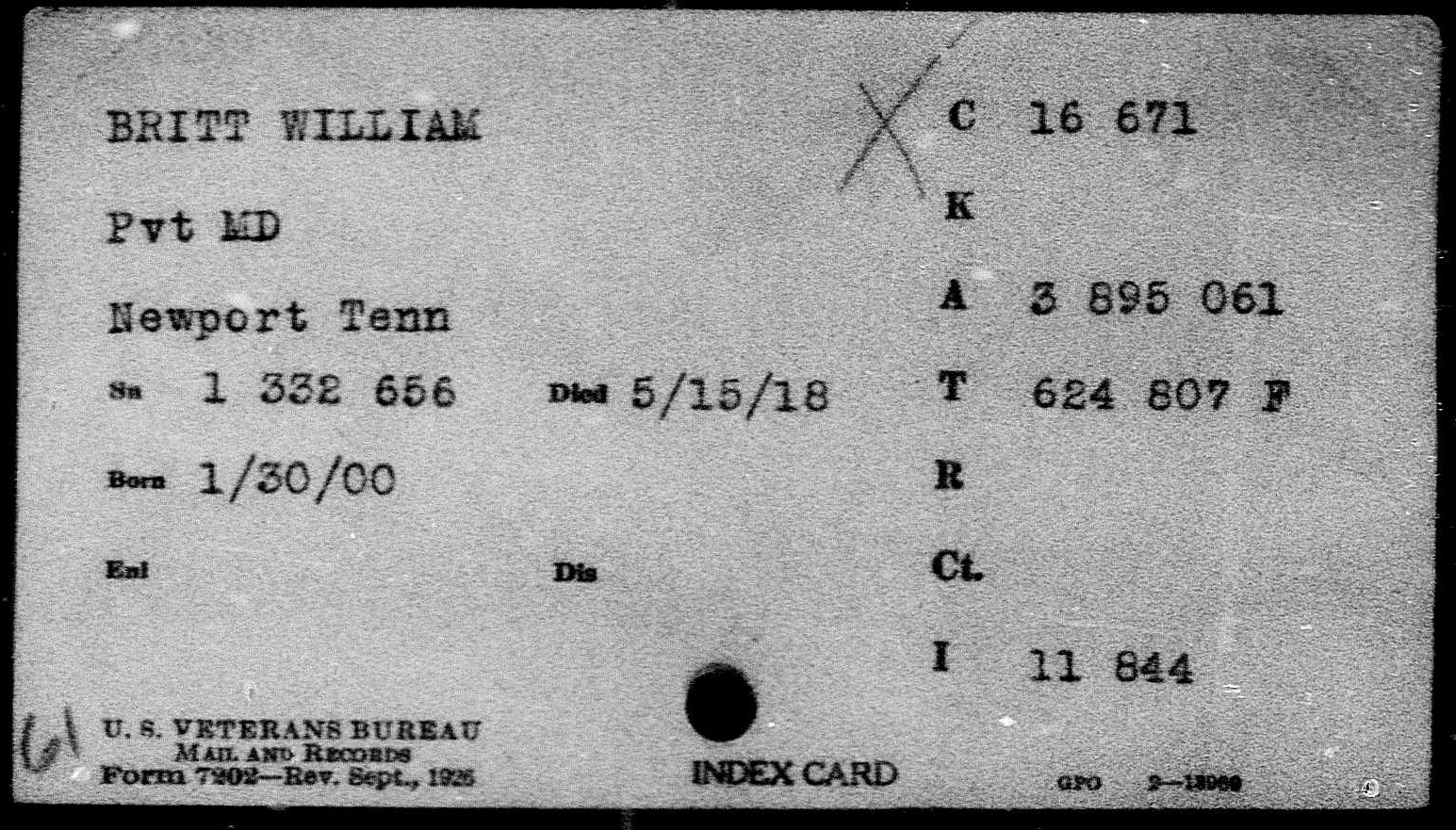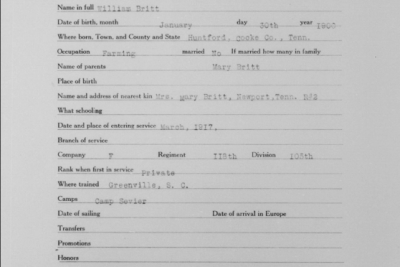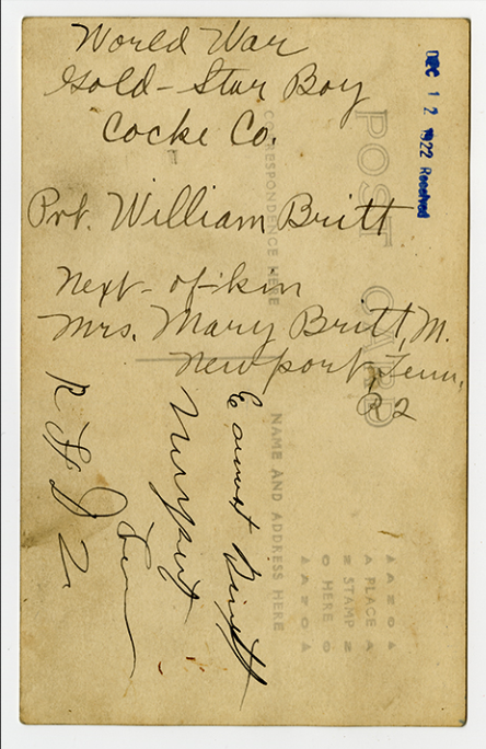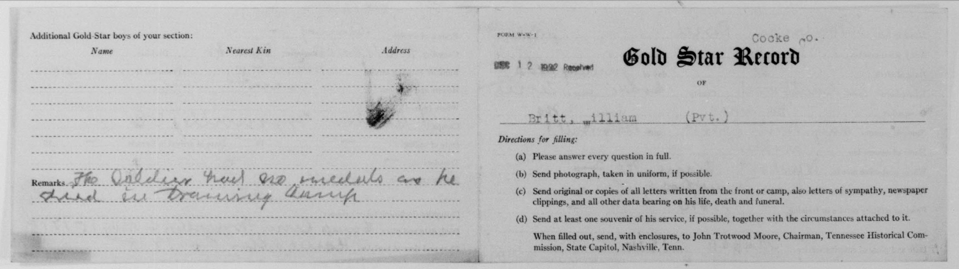 William Britt was born at Huntford, Cocke County, Tennessee. He trained at Greenville, Camp Sevier, S.C where he died of meningitis at the Base Hospital on 15 May 1918 at the age of 18. He was buried at Newport, TN on 24 May 1918