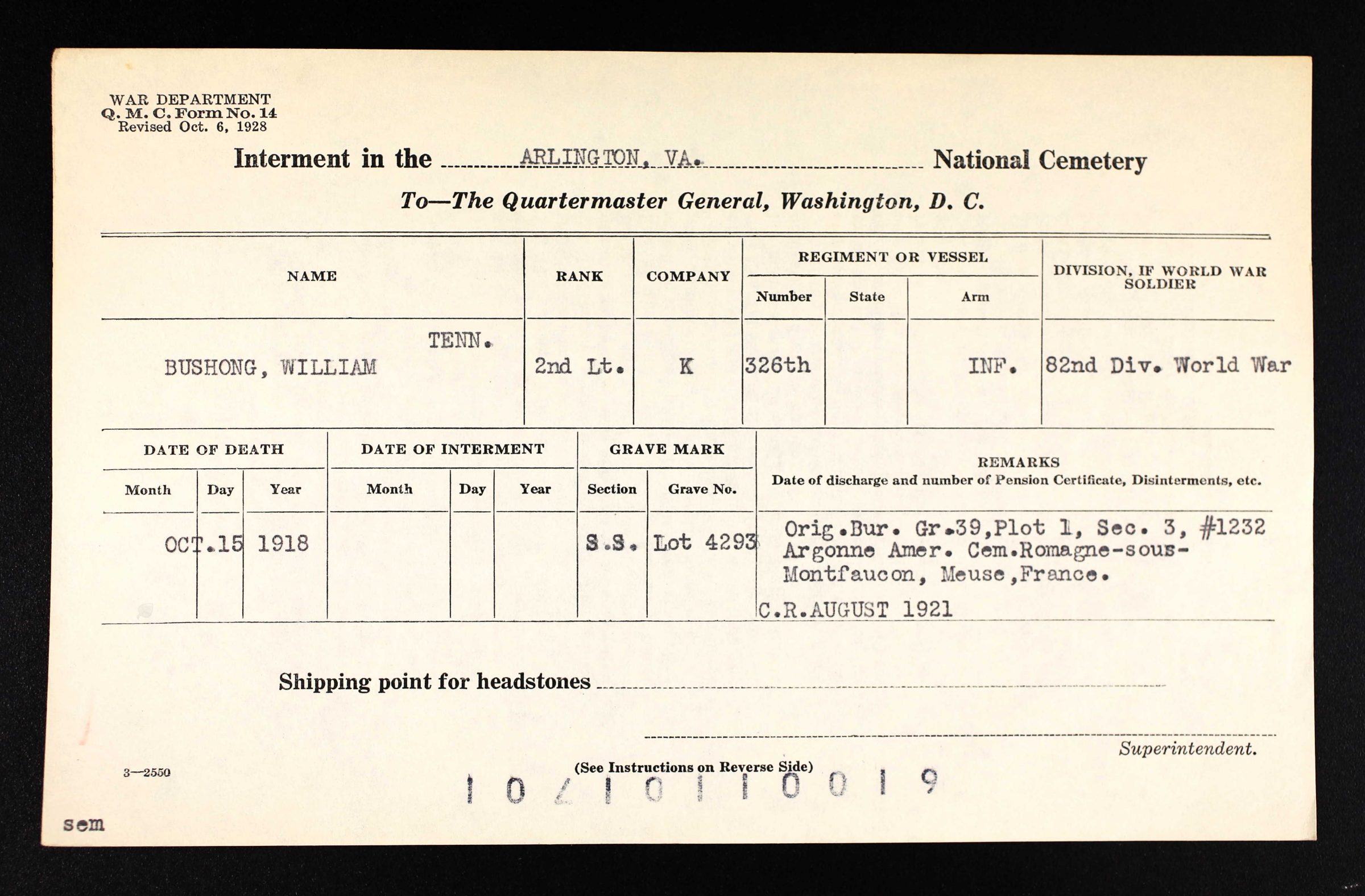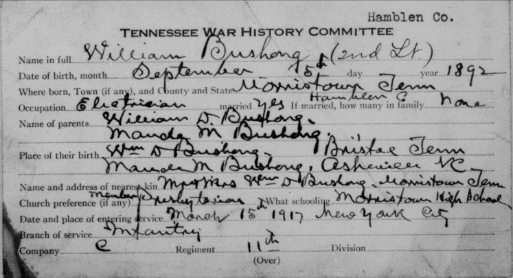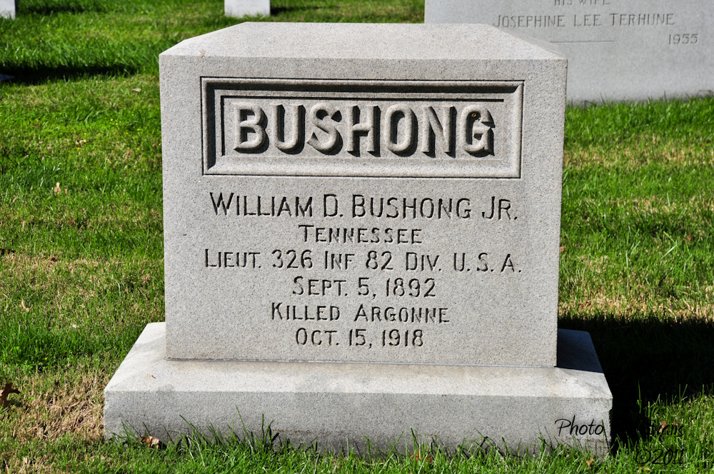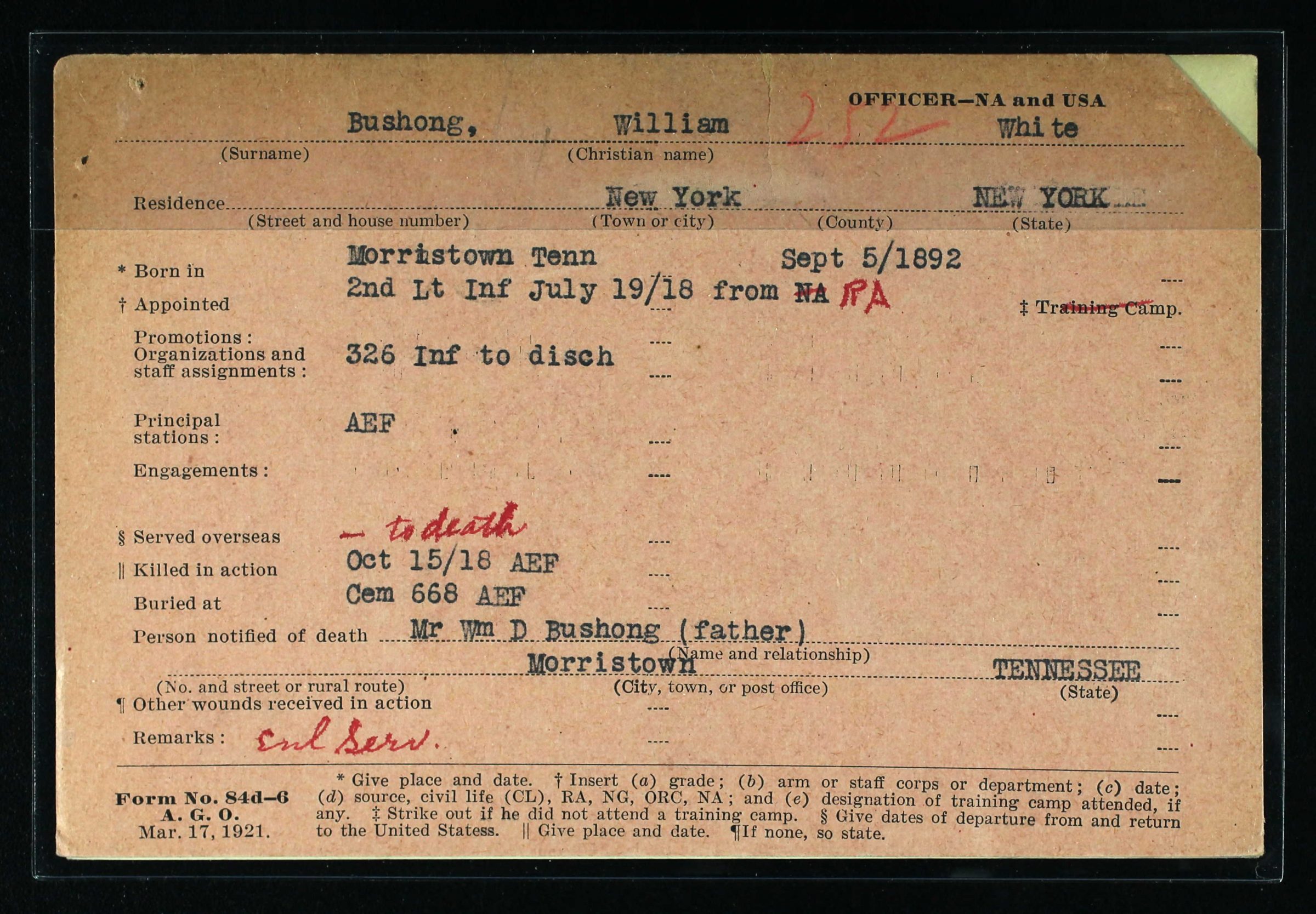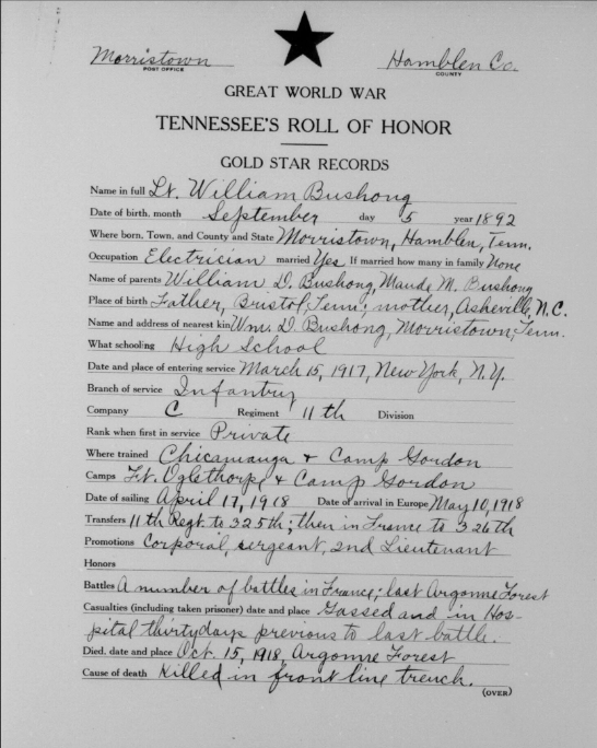 William Bushong was born at Morristown, Tennessee on 5 September 1892. He attended Maryville College at Maryville, TN. During World War I he served with Company K, 326th Infantry Regiment, 82nd Infantry Division. He participated in a number of battles, including the battle at Argonne Forest. He was gassed and in hospital for 30 days previous to his last battle. He was killed in action in the front line trench on 15 October 1918 in the Argonne (France).