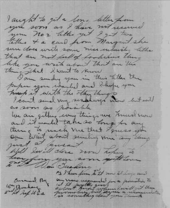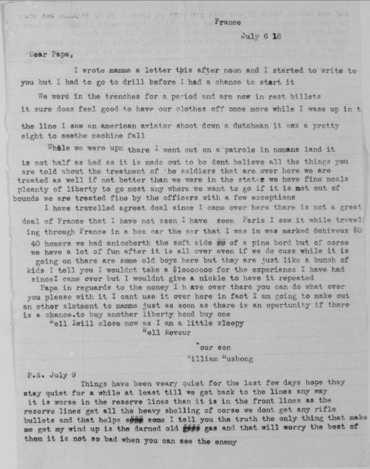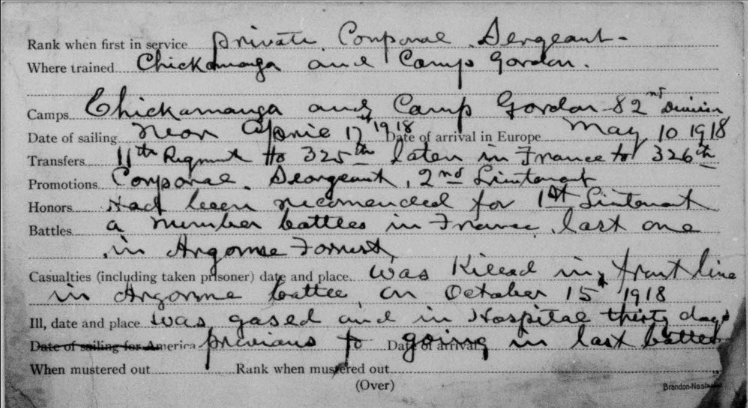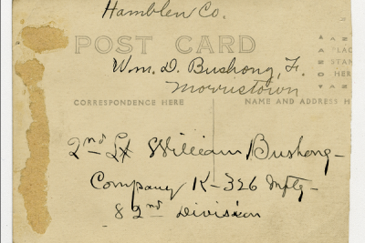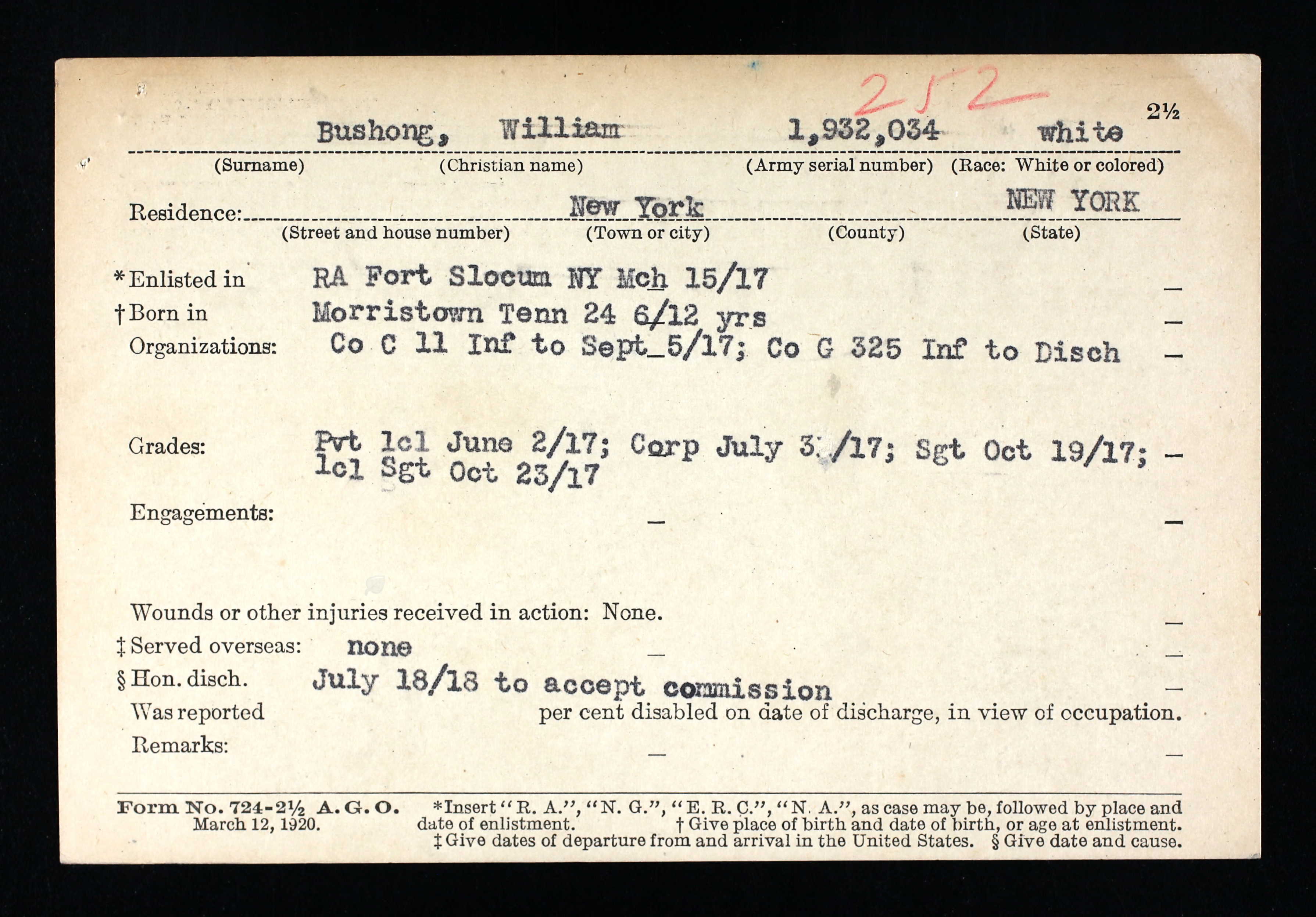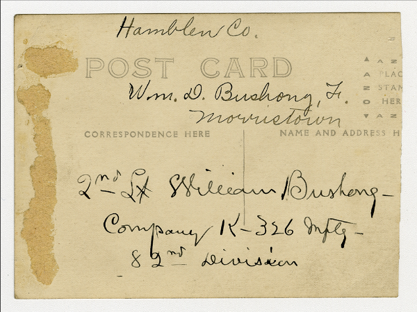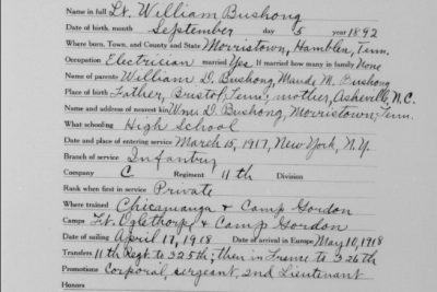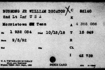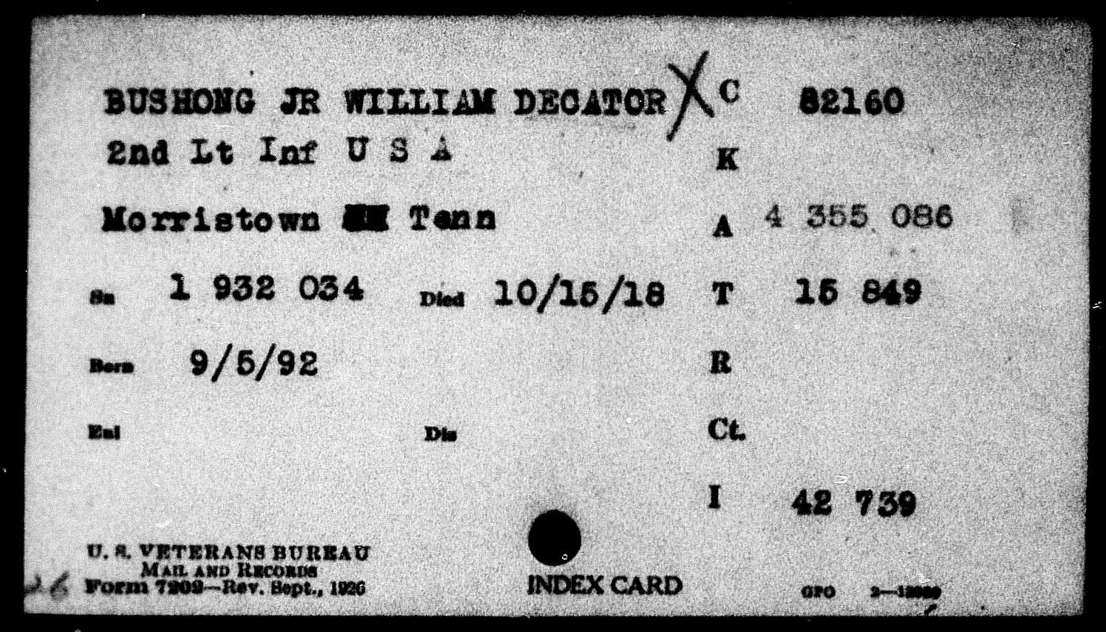 William Bushong was born at Morristown, Tennessee on 5 September 1892. He attended Maryville College at Maryville, TN. During World War I he served with Company K, 326th Infantry Regiment, 82nd Infantry Division. He participated in a number of battles, including the battle at Argonne Forest. He was gassed and in hospital for 30 days previous to his last battle. He was killed in action in the front line trench on 15 October 1918 in the Argonne (France).