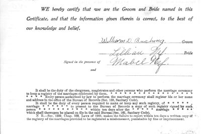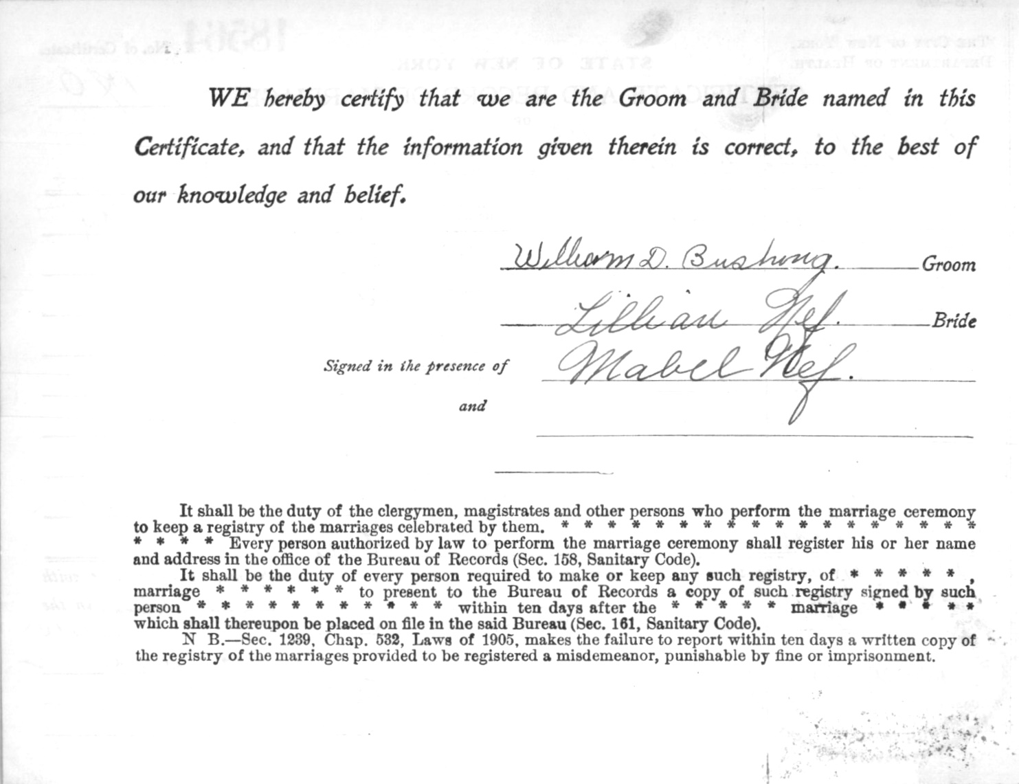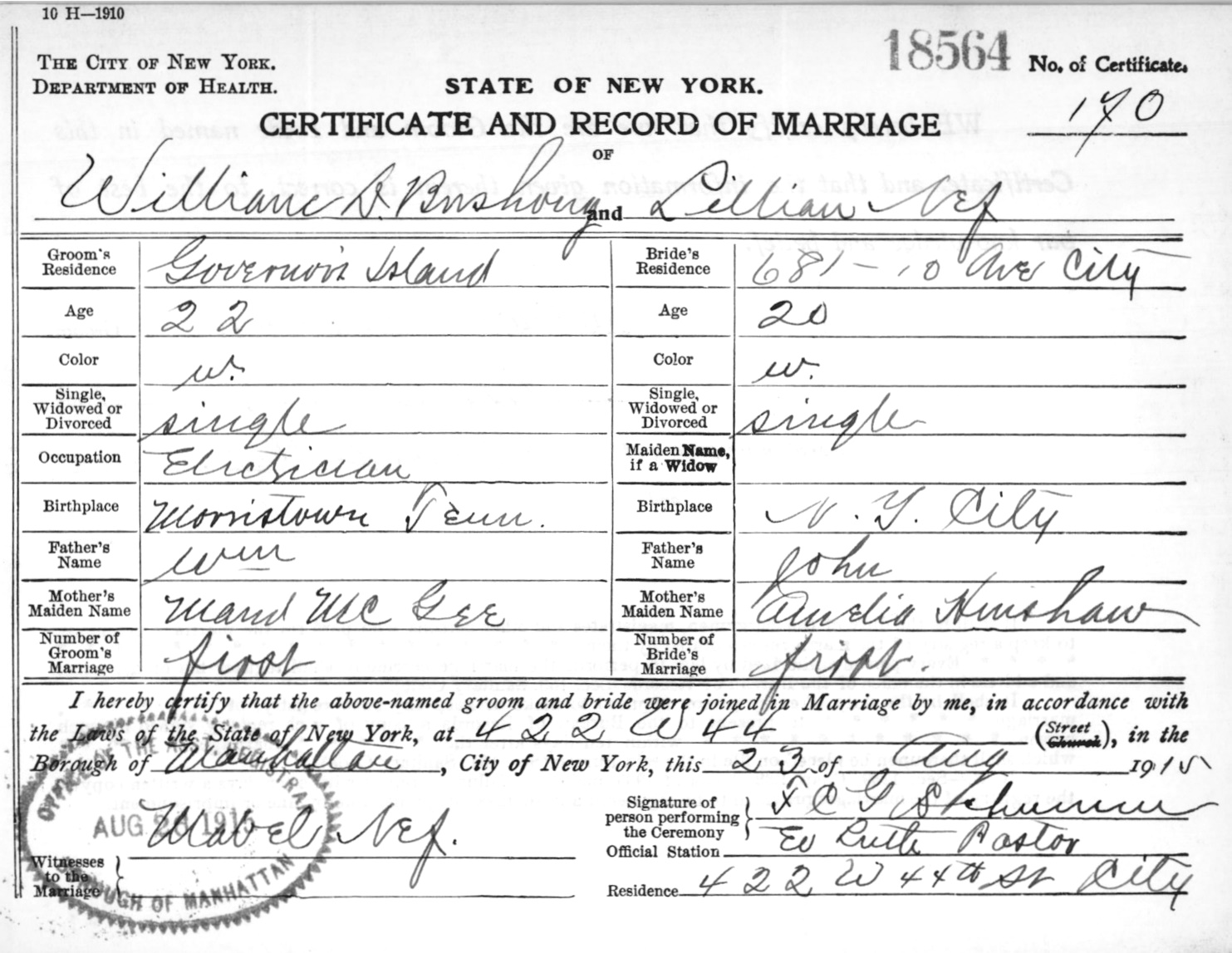 | William D. Bushong married Lillian Nef of Manhattan, New York on August 23, 1915. |