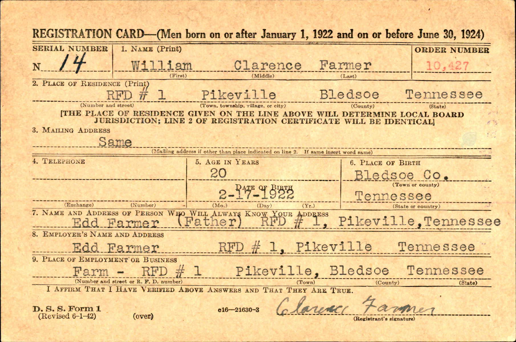 PFC William Clarence Farmer was killed in action. He was the son of Clarence Edward Farmer and Maggie Lou Neeley.