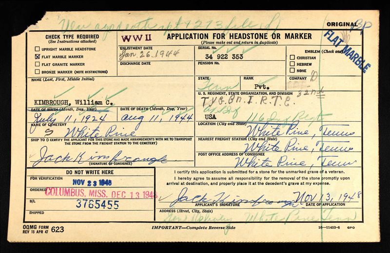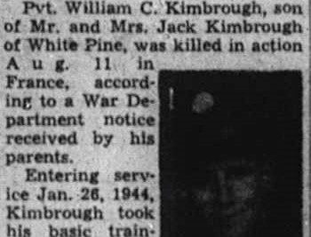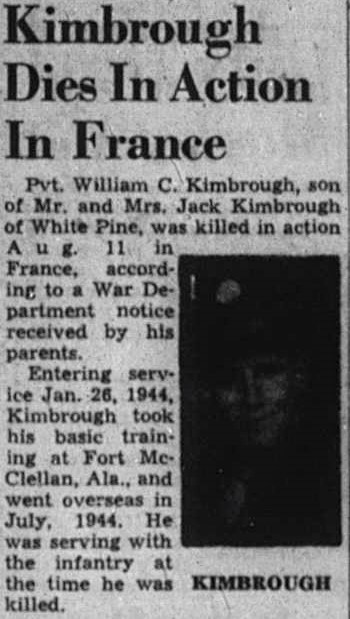 Pvt. William C. Kimbrough, son of Mr. and Mrs. Jack Kimbrough of White Pine, was killed in action Aug. 11 in France, according to a War Department notice received by his parents.
