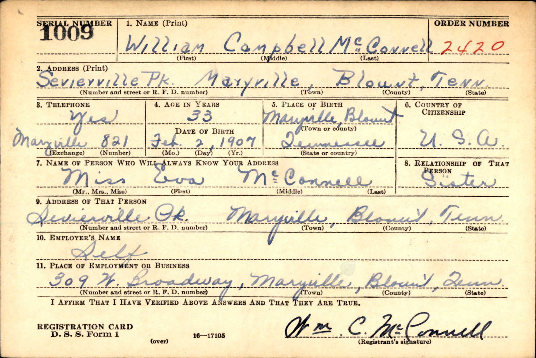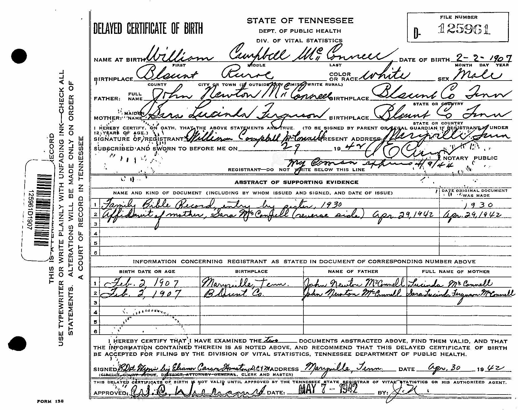 William Campbell McConnell was born at Maryville, Tennessee, the son of John Newton McConnell and Sara Lucinda McConnell. He married Clara Mae Thompson in 1942.