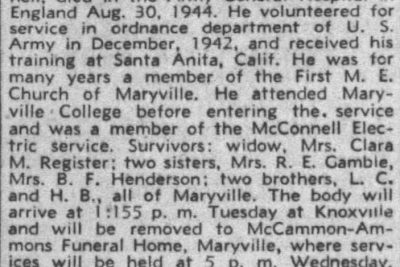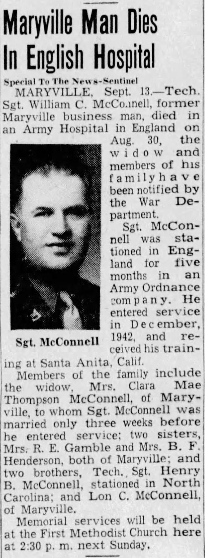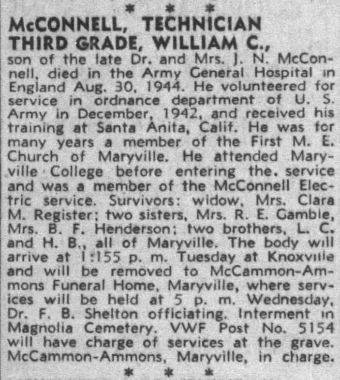 Technician 3rd Class William C. McConnell was the husband of Clara Thompson McConnell and the brother of Mrs. R. E. Gamble, Mrs. B. F. Henderson, Technical Sergeant Henry B. McConnell, and Lon C. McConnell. Technician 3rd Class William C. McConnell died in an English hospital on August 30, 1944. His death was reported in the Maryville Enterprise on September 14. McConnell, a former Maryville business man, died in an Army hospital in England on August 30, his widow and members of his family were notified by the War Department. Sgt. McConnell had just written his wife, the former Clara Thompson, that he would shortly undergo an operation for a kidney ailment. His death is thought to have been caused by complications which set in after the operation. He was buried in an English cemetery. Sgt. McConnell was stationed in England for five months in an Army Ordnance company. He entered service in December, 1942, and received his training at Santa Anita, Calif. Members of the family include his widow, Clara Thompson McConnell; two sisters, Mrs. R. E. Gamble and Mrs. B. F. Henderson both of Maryville; and two brothers, Tech. Sgt. Henry B. McConnell, stationed in North Carolina; and Lon C. McConnell, Maryville.