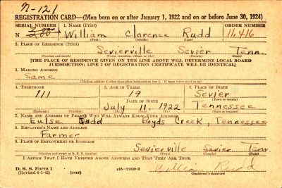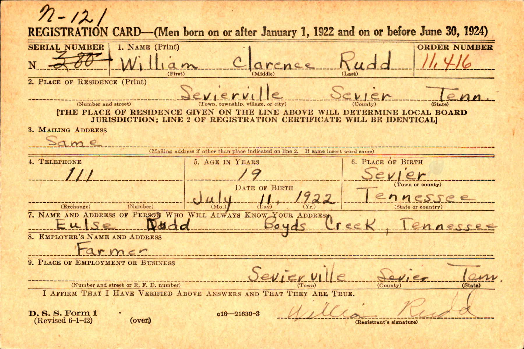 William Clarence Rudd was born on 11 July 1922 in Sevier, Tennessee. He was the son of William Eulace Rudd and Josie V. Reed.