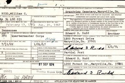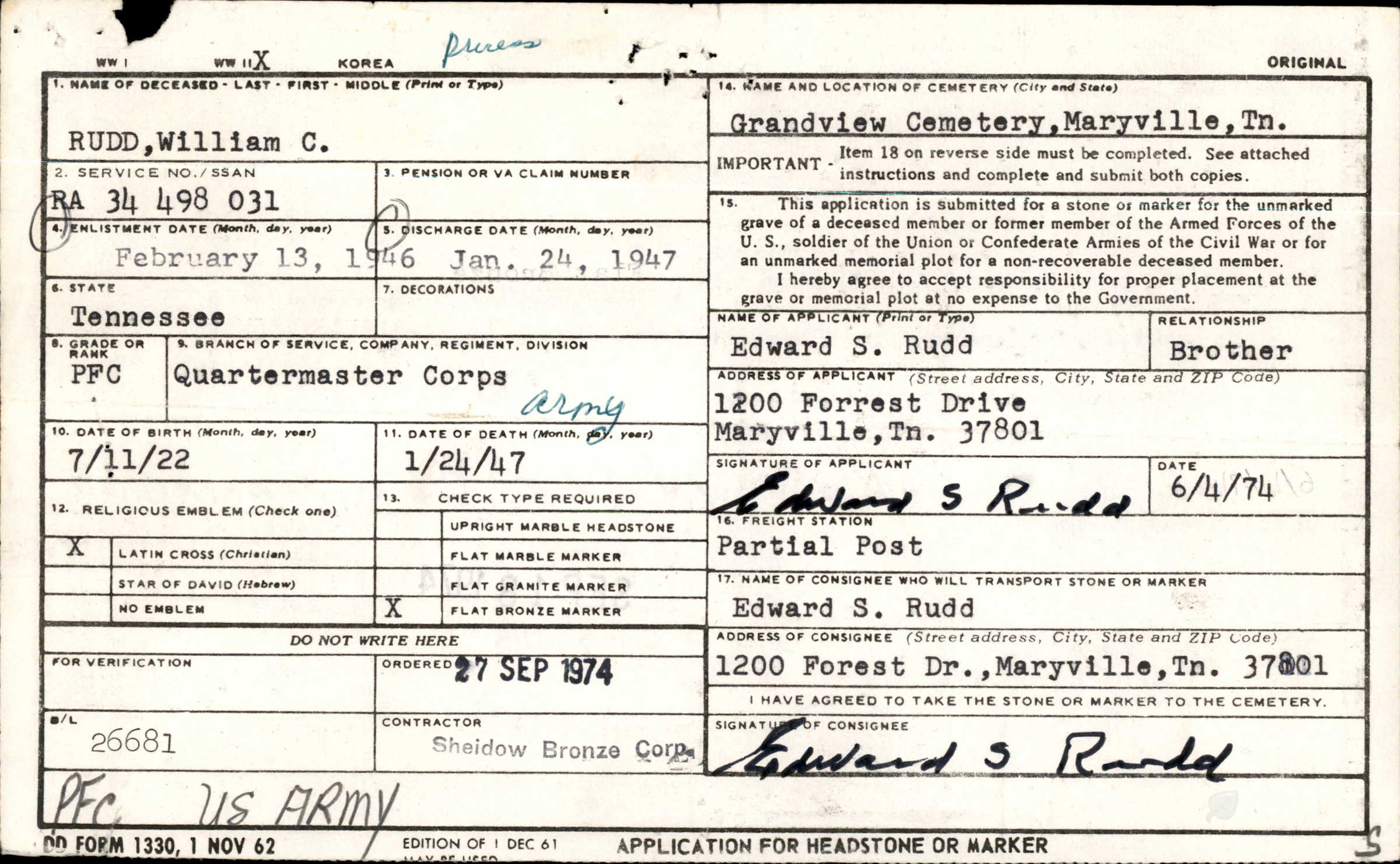 PFC Rudd enlisted on 13 February 1946 at Camp Chaffee, Fort Smith, Arkansas. He died on 24 January 1947 in service to his country at the age of 24. He is buried at Boyds Creek Cemetery, Sevier County, Tennessee.