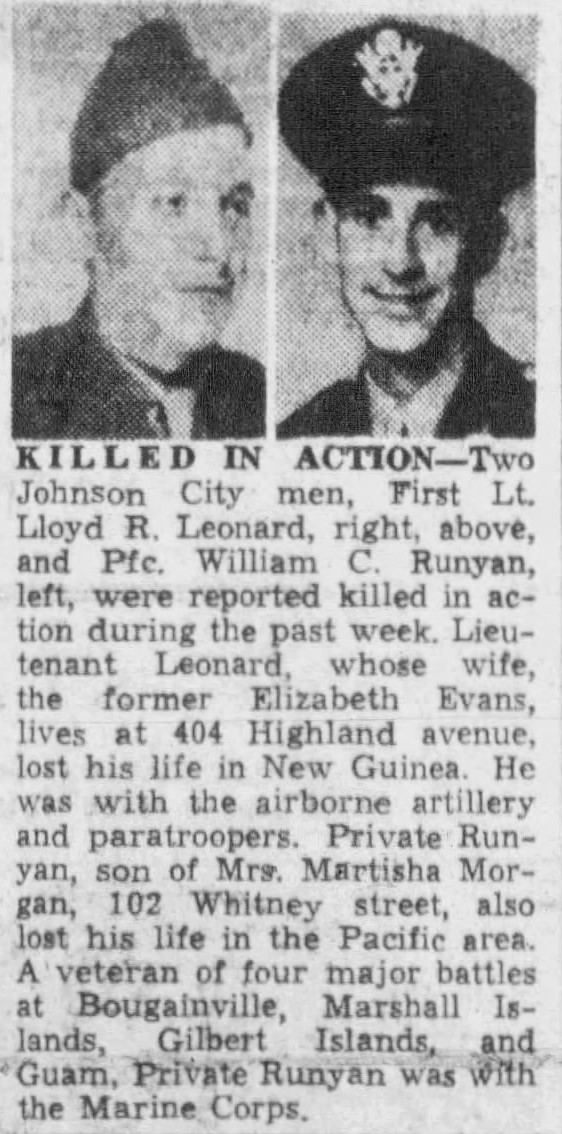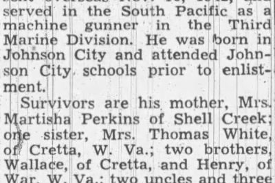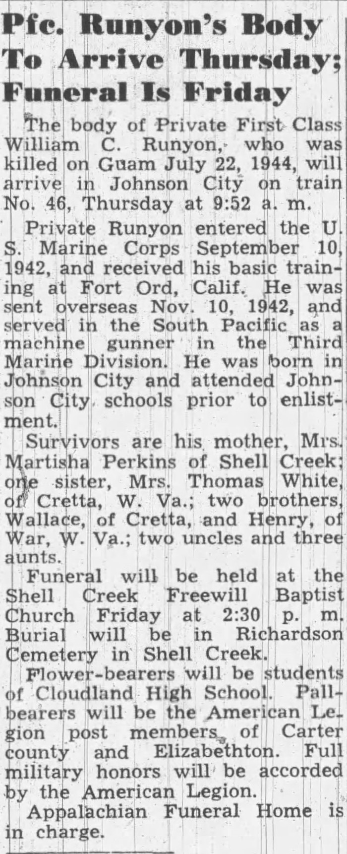 William was promoted to Private First Class on 26 January 1944 and soon learned their next operational mission would be the island of Guam, Mariana Islands. The second Battle of Guam (Operation Stevedore) began with the invasion on 21 July 1944 when the 3rd Marine Division hit the beaches at 0828 hours (8:28am) on the western side of the island in the Orote Peninsula near the town of Agana north of Orote and at the Asan Point. William was Killed in Action the following day during a Japanese counterattack. He was 19 years old. William was interred in Row 8, Grave 6 of the Army, Navy and Marine (AN&M) American Cemetery #1 on Guam. He was reinterred in April of 1948 to the Lindy Richardson Cemetery on the grounds of the Morgan Branch Freewill Baptist Church in Shell Creek, Roan Mountain, Tennessee.