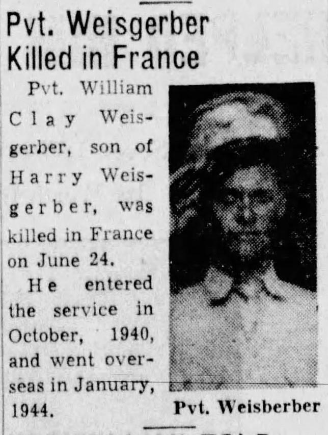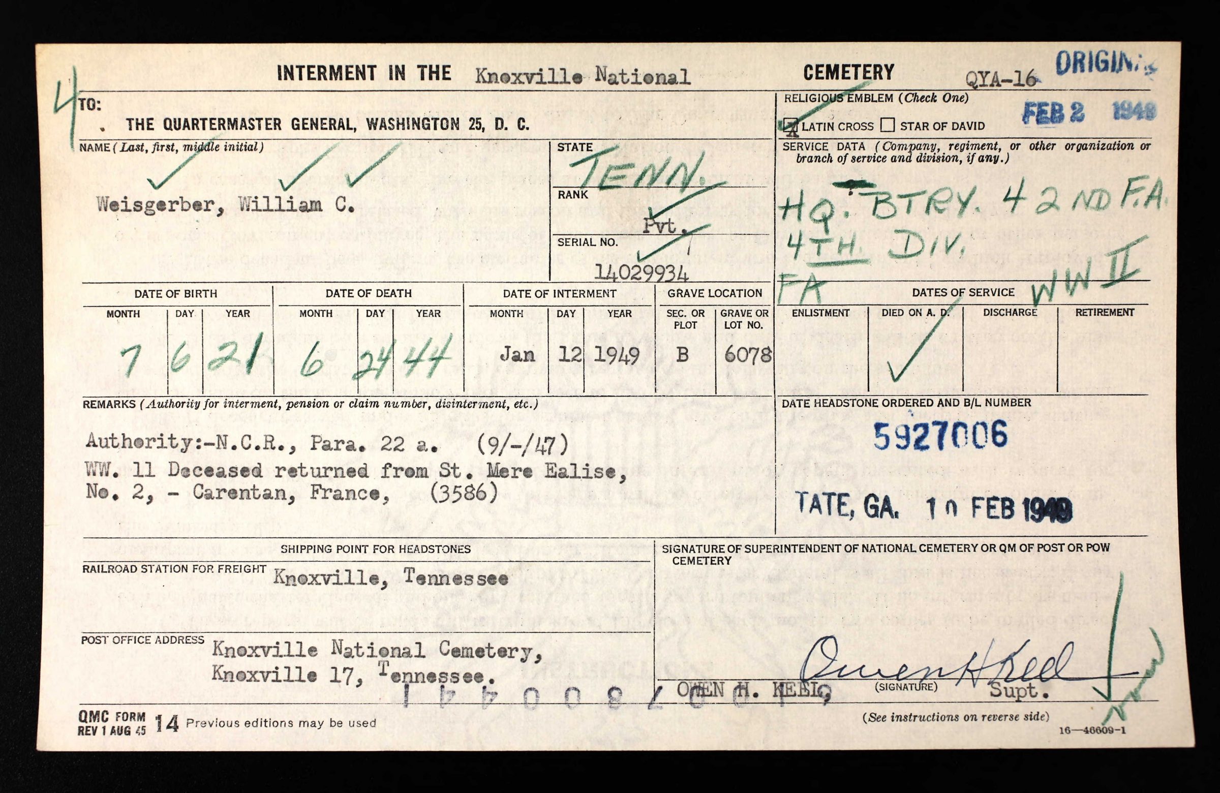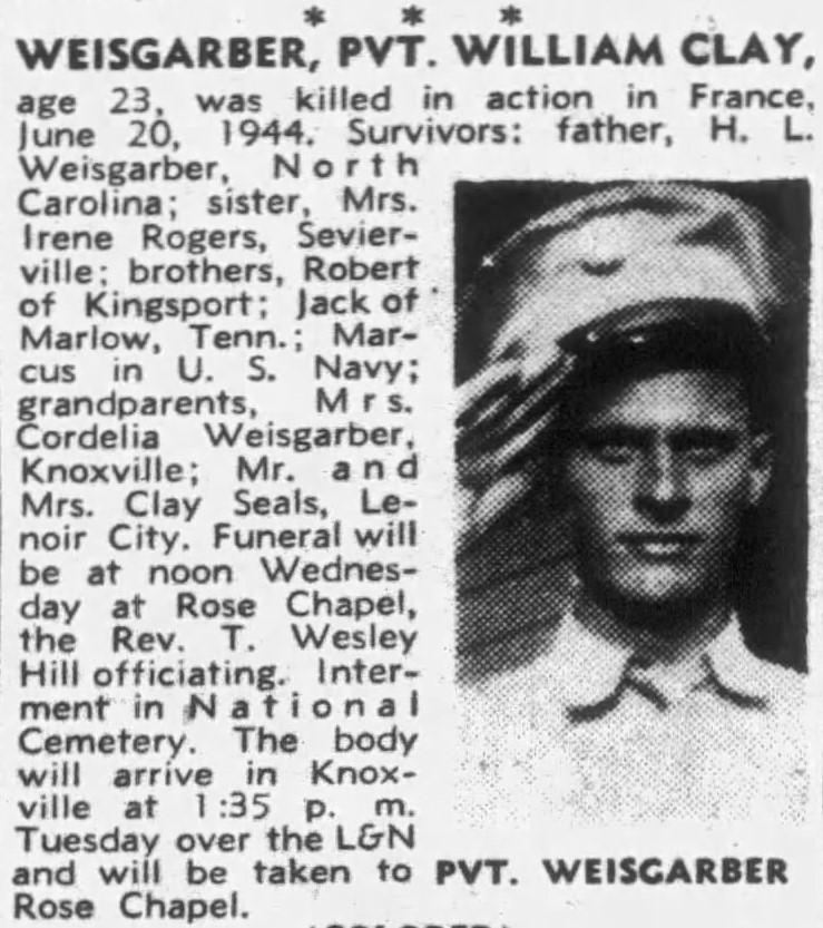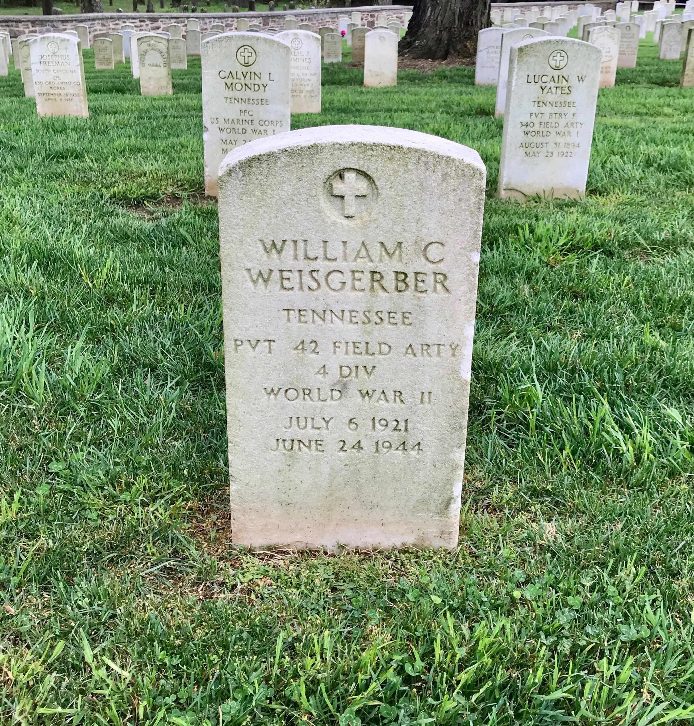 William Clay Weisgerber was born 6 July 1921 in Anderson County, Tennessee. His parents were Harry Lee Weisgerber and Elizabeth Mae Seals. He enlisted on 18 October 1940 and served as a Pvt. in HQ Battery, 42nd Field Artillery. He died 24 June 1944 in France and was initially buried at Sainte- Mère-Eglise #2 Cemetery at Carentan, France. Interment date 12 January 1949 in Knoxville National Cemetery, Knoxville, Tennessee. Section B – Site 6078