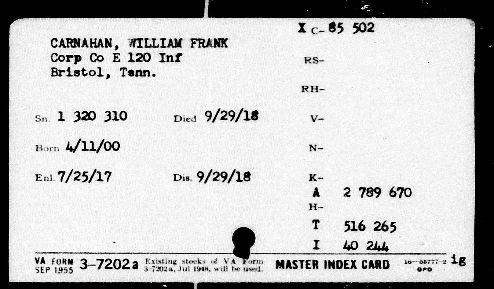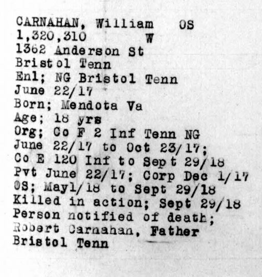 Cpl Carnahan was killed while serving his country in France on September 29, 1918. He is buried at East Hill Cemetery in Bristol, Sullivan County, Tennessee.