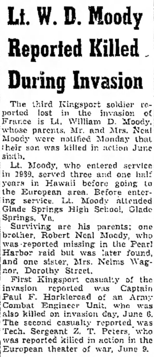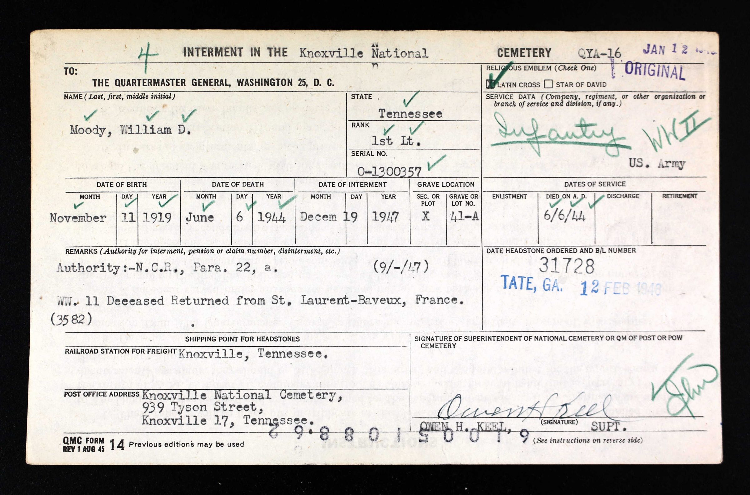 1st Lieutenant William Moody returned from St. Laurent-Bayeux, France and was buried December 19, 1947, at the US National Cemetery in Knoxville.