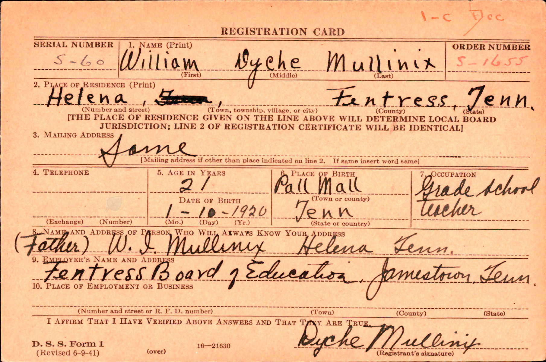 William Dyche Mullinix was born at Pallmall, Tennessee, the son of William Isham Mullinex and and Ida Ellen Crouch. He attended Middle Tennessee State University at Murfreesboro, Tennessee. He enlisted in the Air Corps on 1 April 1942 at Knoxville, Tennessee.