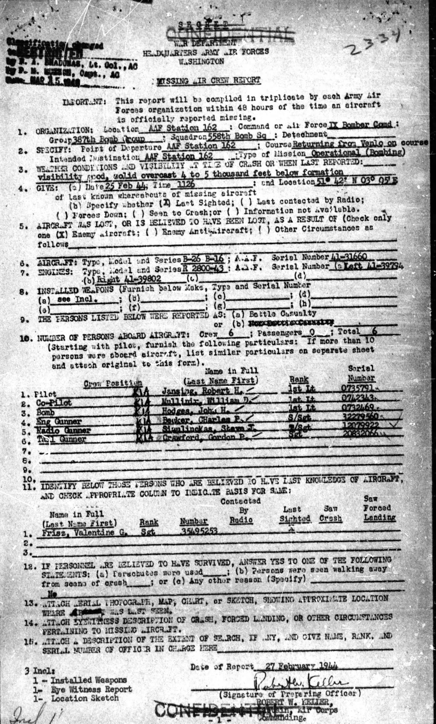 On 25 February 1944, Marauder B-26B-16, Serial number 41-31660, nickname Jessie, departed from AAF Station 162 (RAF Rattlesden, England) on an Operational Bombing mission to an airfield at Venlo, the Netherlands. It crashed into the North Sea off the Dutch coast at Scheldemonding, the Netherlands.