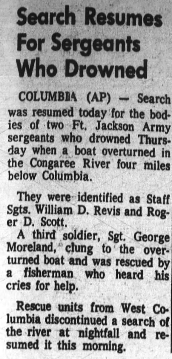 Columbia – Search was resumed today for the bodies of two Ft. Jackson Army sergeants who drowned Thursday when a boat overturned in the Congaree River four miles below Columbia.