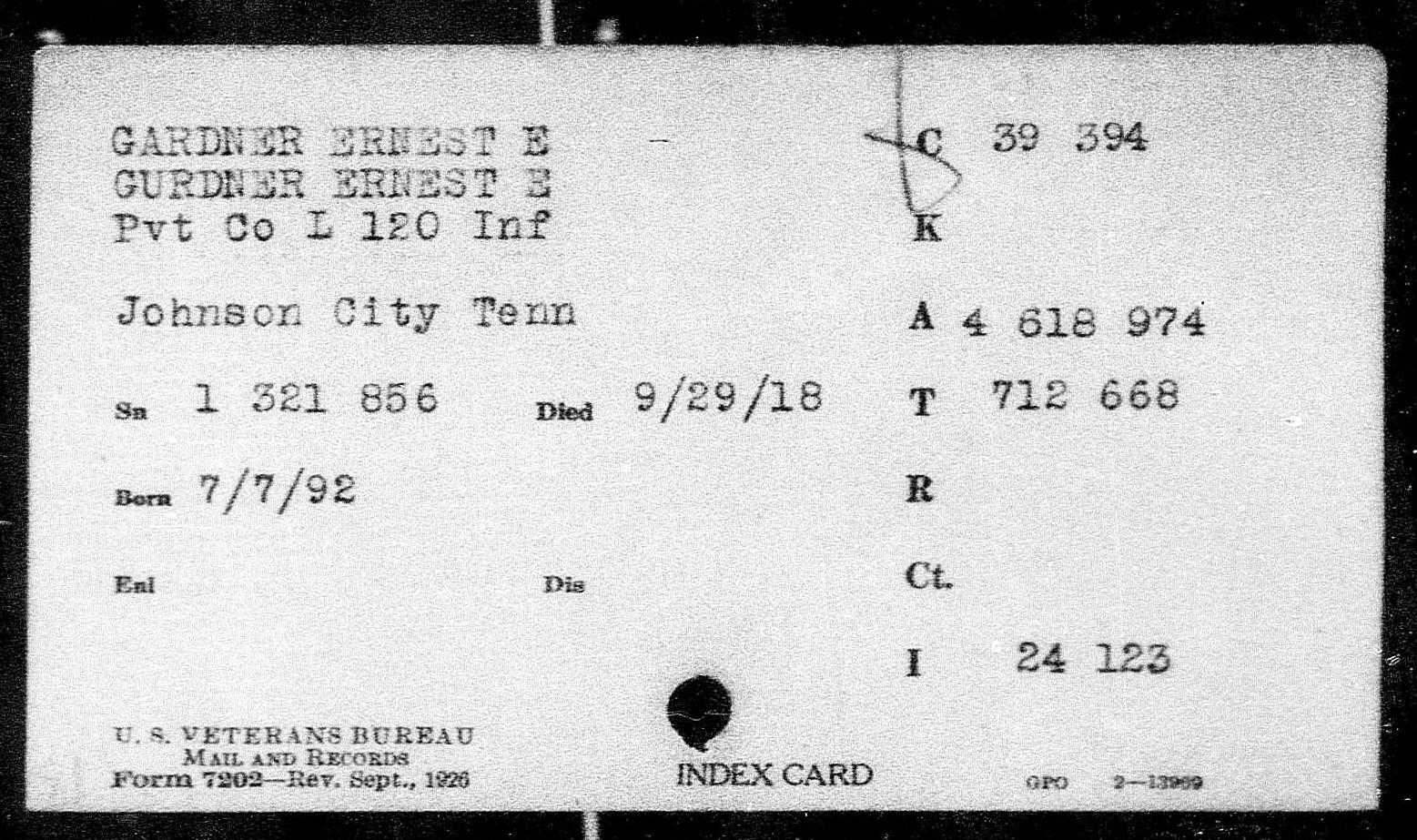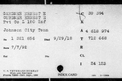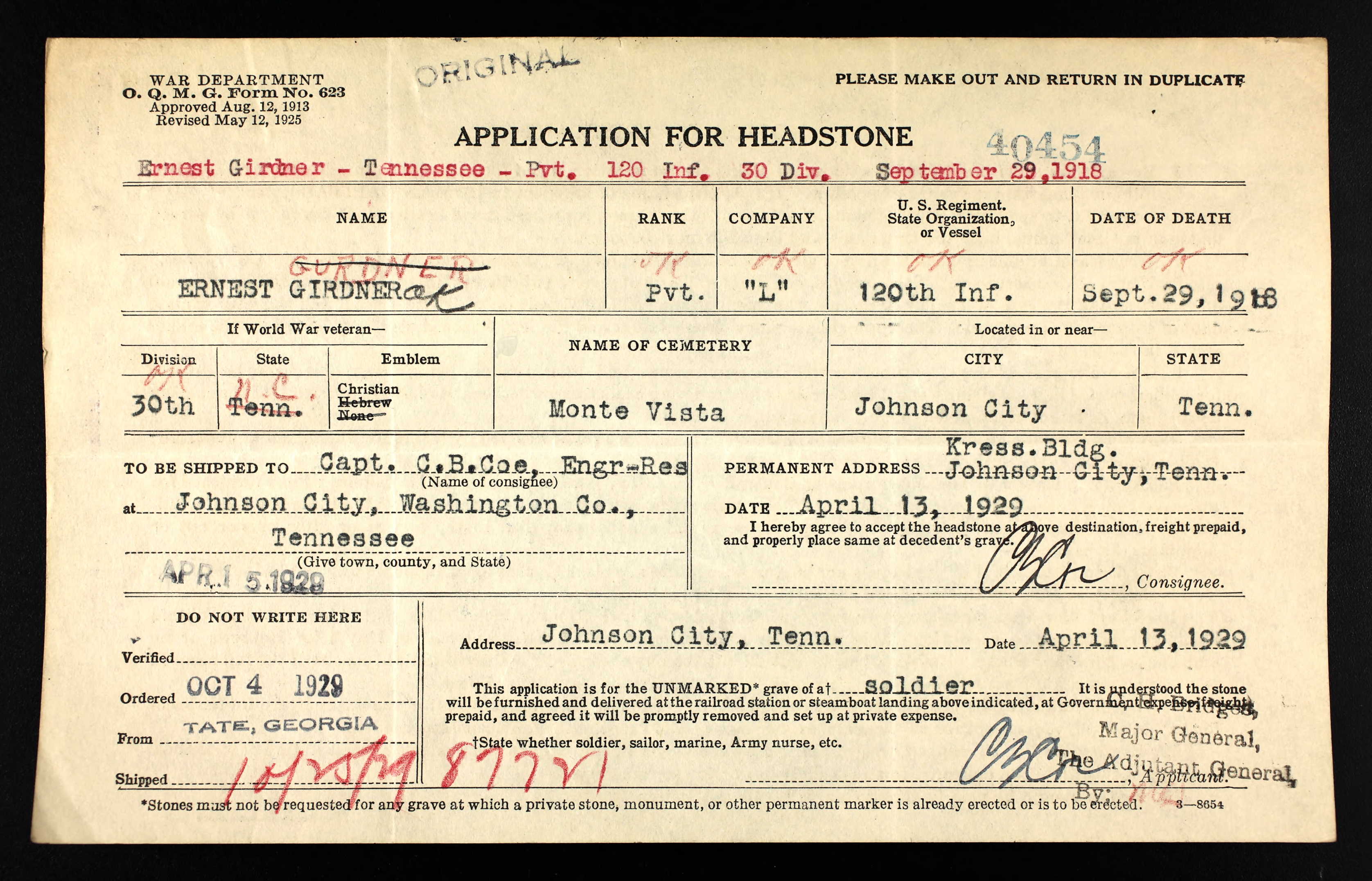He was assigned to Company L, 3rd Battalion, 120th Infantry Regiment, 60th Infantry Brigade, 30th Division. He participated in two unit campaigns: Ypres-Lys Offensive in Belgium where he was wounded in action on 31 August 1918 and the Somme Offensive in France. It was during this offensive when the 30th Division broke through the Hindenburg Line that Ernest was hit by a large piece of shrapnel in the stomach that took his life. He was 25 years old and the older brother of Curtis Girdner who was Killed in Action on 31 August 1918. They now rest side by side.