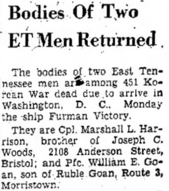 The bodies of two East Tennessee man are among 451 Korean War dead due to arrive in Washington, D.C., Monday on the ship Furman Victory.