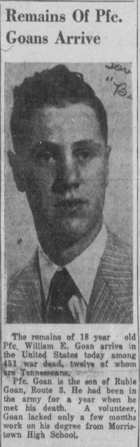 Pfc. William E. Goan, son of Ruble Goan Route 3, Morristown.