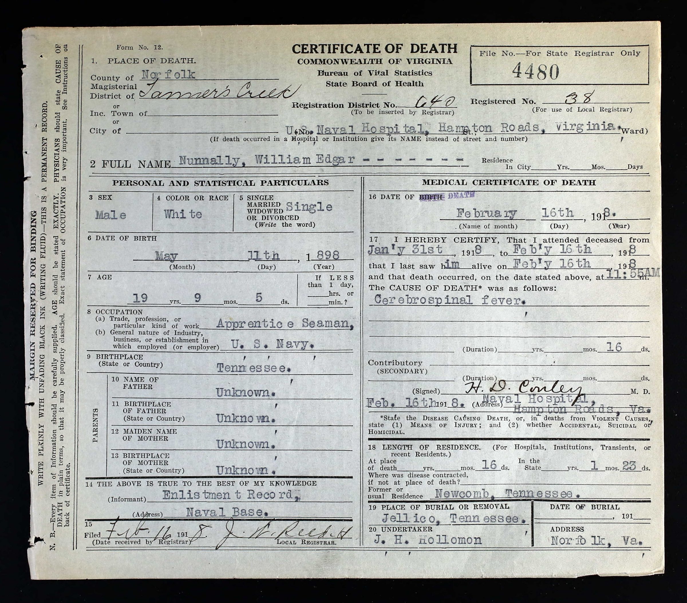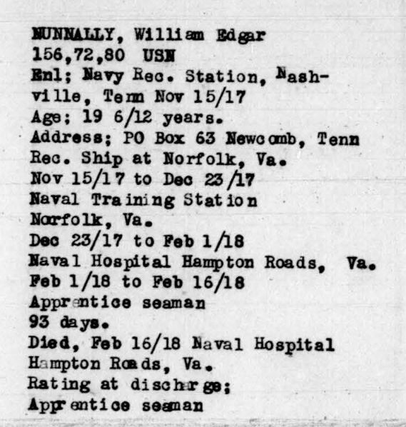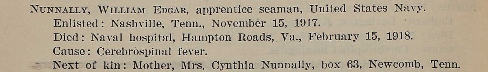 William Edgar Nunnally was born in Jellico, Campbell County, Tennessee to Robert Lee Nunnally and Cynthia Ella Douglas. He enlisted at the Navy recruiting station in Nashville, TN on 15 November 1917. Died at Naval Hospital, Hampton Roads, VA, of disease 15 February 1918 at the age of 19.