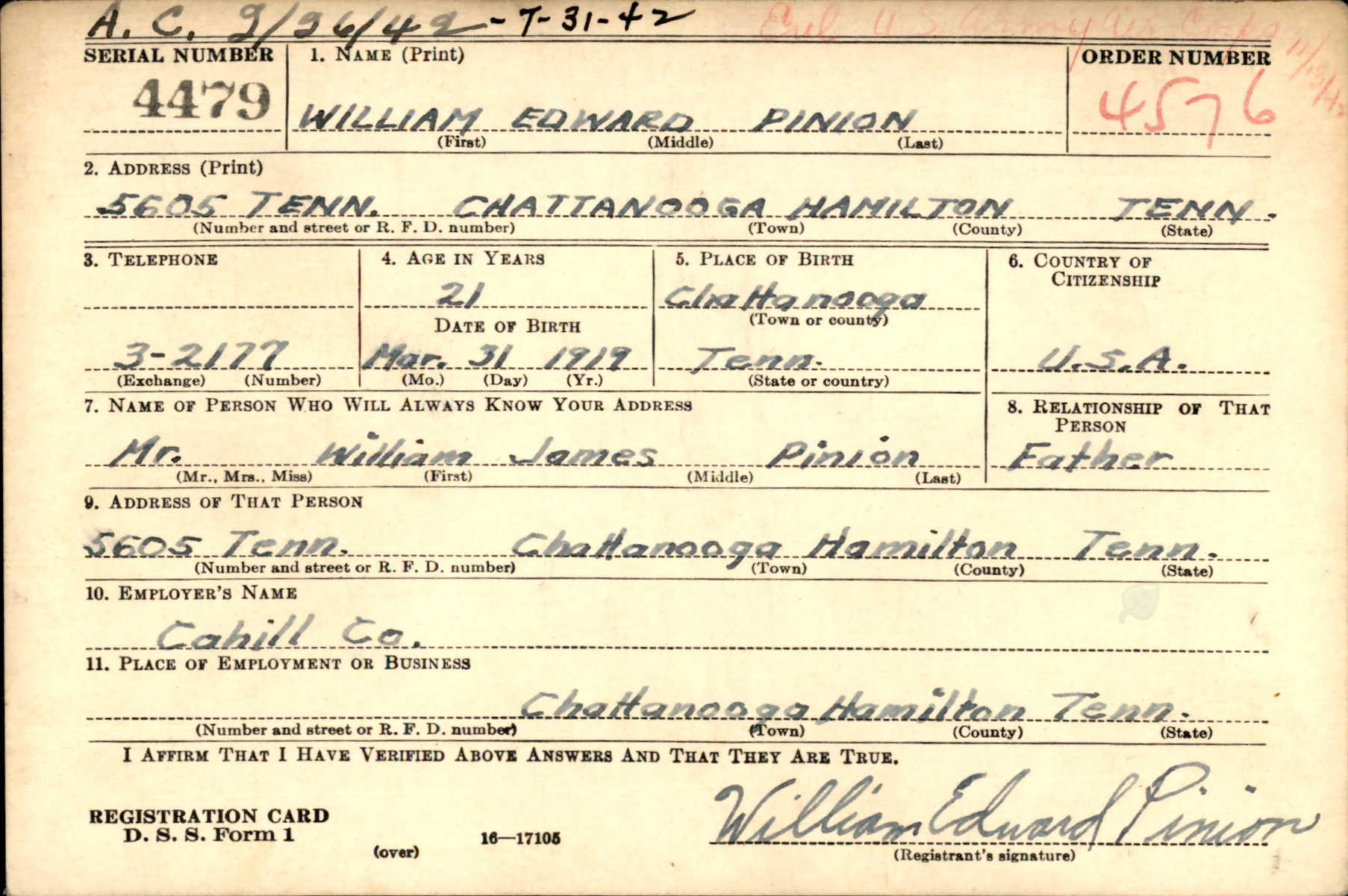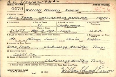 William Edward Pinion was born in Chattanooga, Tennessee to William James Pinion and Edna Inez Smith.