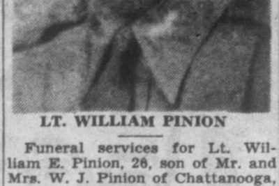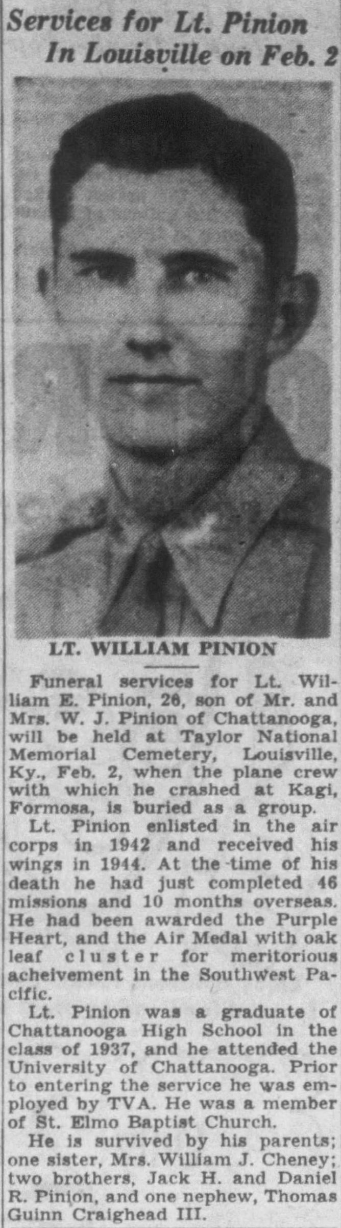 Funeral services for Lt. William E. Pinion, 26, son of Mr. and Mrs. W.J. Pinion of Chattanooga, will be held at Taylor National Memorial Cemetery, Louisville, Ky., Feb. 2, when the plane crew with which he crashed at Kagi, Formosa, is buried as a group. Lt. Pinion enlisted in the air corps in 1942 and received his wings in 1944. At the time of his death he had just completed 46 missions and 10 months overseas. He had been awarded the Purple Heart, and the Air Medal with Oak Leaf Cluster for meritorious achievement in the Southwest Pacific.