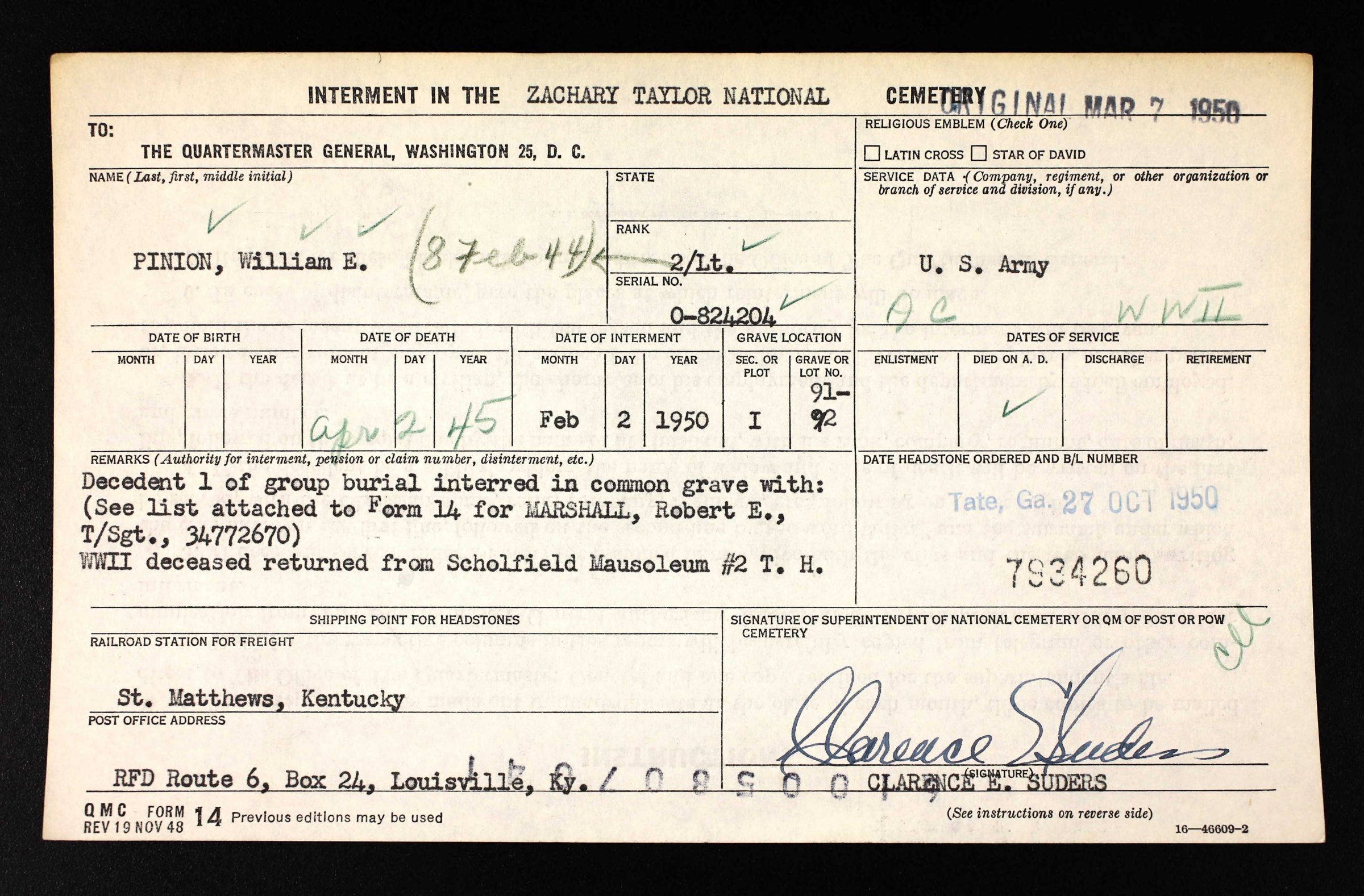 2nd Lt William Pinion is buried at Zachary Taylor National Cemetery in Kentucky together with T/Sgt Robert E. Marshall, T/Sgt Harry A. Neff, 1st Lt Thomas J. Paul Jr, 1st Lt Frank J. Rearden Jr. and S/Sgt Gordon P. Stone. 2nd Lt William Pinion returned from Scholfield Mausoleum #2 T.H. in 1950.