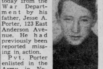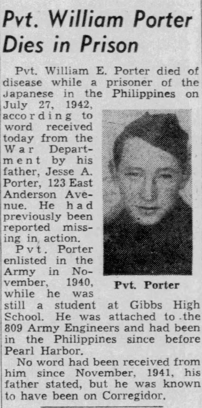 Pvt. William E. Porter died of disease while a prisoner of the Japanese in the Philippines on July 27, 1942, according to word received today from the War Department by his father, Jesse A. Porter, 123 East Anderson Avenue. He had previously been reported missing in action. Pvt. Porter enlisted in the Army in November, 1940, while he was still a student at Gibbs High School. He was attached to the 809 Army Engineers and had been in the Philippines since before Pearl Harbor. No word had been received from him since November, 1941, his father stated, but he was known to have been on Corregidor.