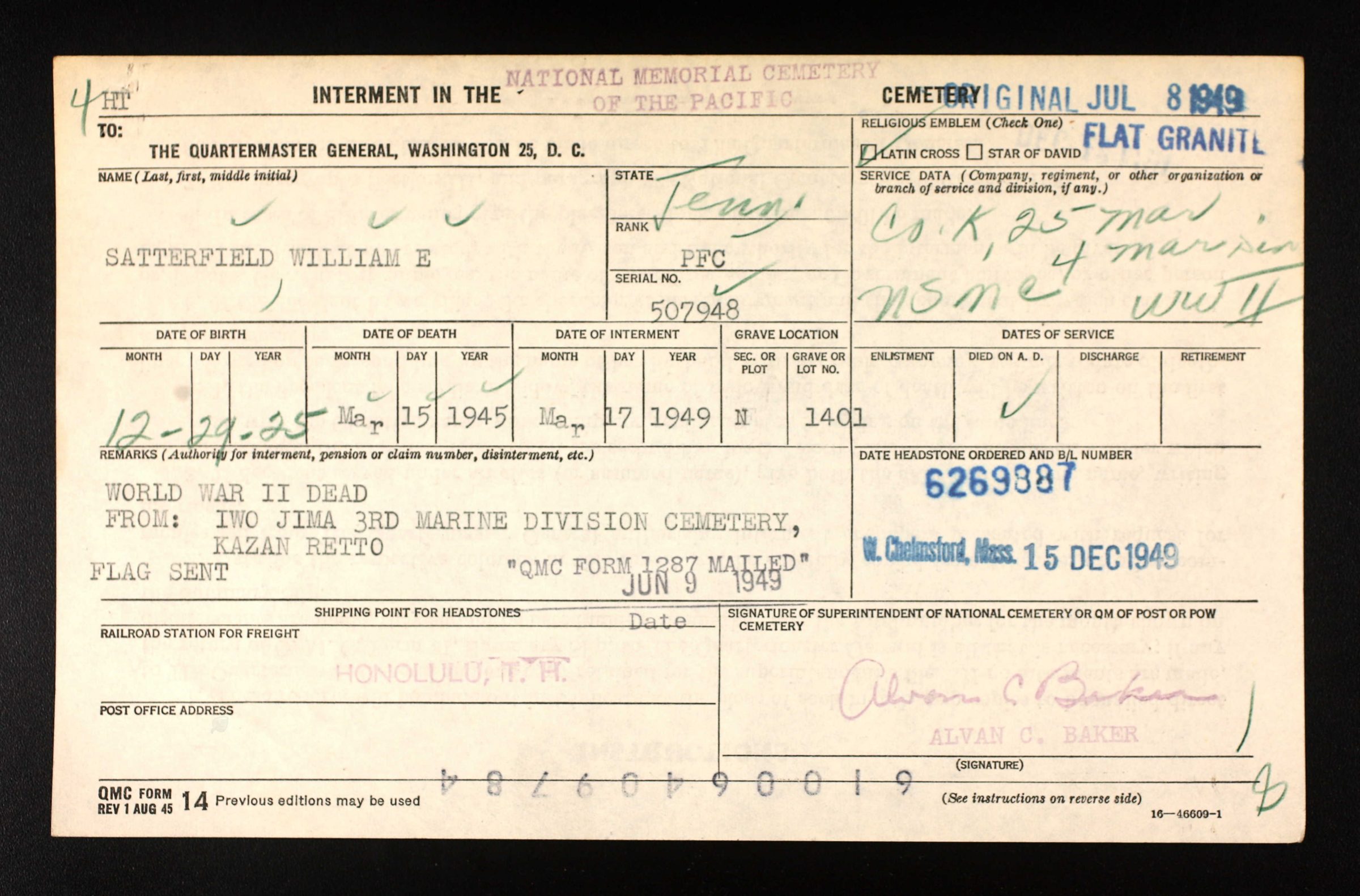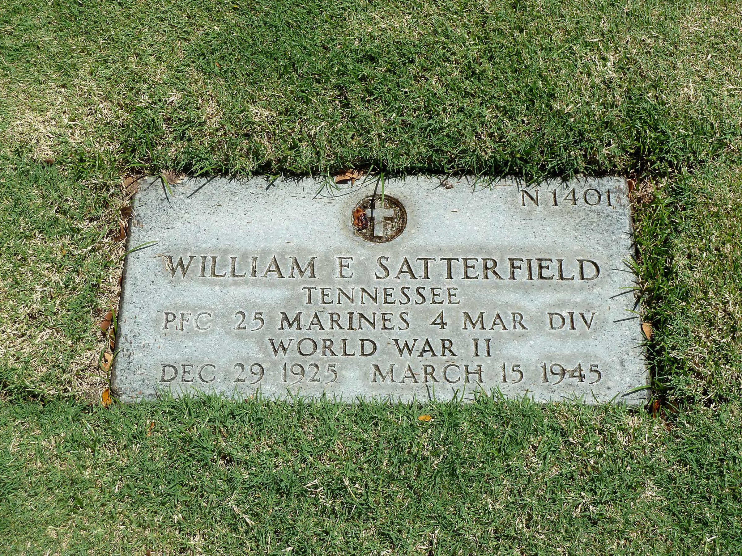 William Satterfield was initially buried at Iwo Jima 3rd Marine Division Cemetery, Kazan Retto. He is buried at the Honolulu, HI Cemetery, Plot N, Grave 14.