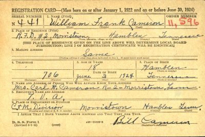 William Frank “Billie” Cameron was born in Morristown, Hamblen County, Tennessee on 3 June 1924. He graduated Morristown High School, Class of 1942 and started work with the Tennessee Valley Authority (TVA), C&M Division in Morristown. His parents moved to Johnson City, Washington County, Tennessee and he transferred with the TVA to stay with them. It was here that he decided to follow in his older brother’s footsteps and join the United States Army Air Forces.