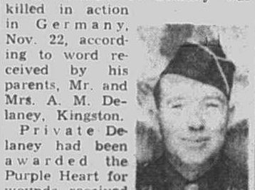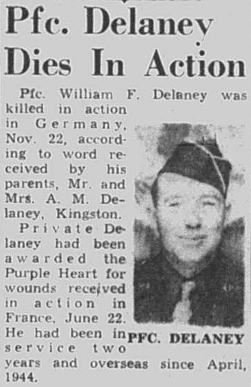 Army Pfc. William F. Delaney of Kingston had been declared unrecoverable before dental and DNA analysis identified his remains, Defense Department officials said. Delaney, 24, was fighting with the 4th Infantry Division when his battalion launched an artillery strike against German soldiers near Grosshau in the Hürtgen Forest on Nov. 22, 1944. An enemy artillery shell struck Delaney’s foxhole, and he died before he could be medically evacuated.