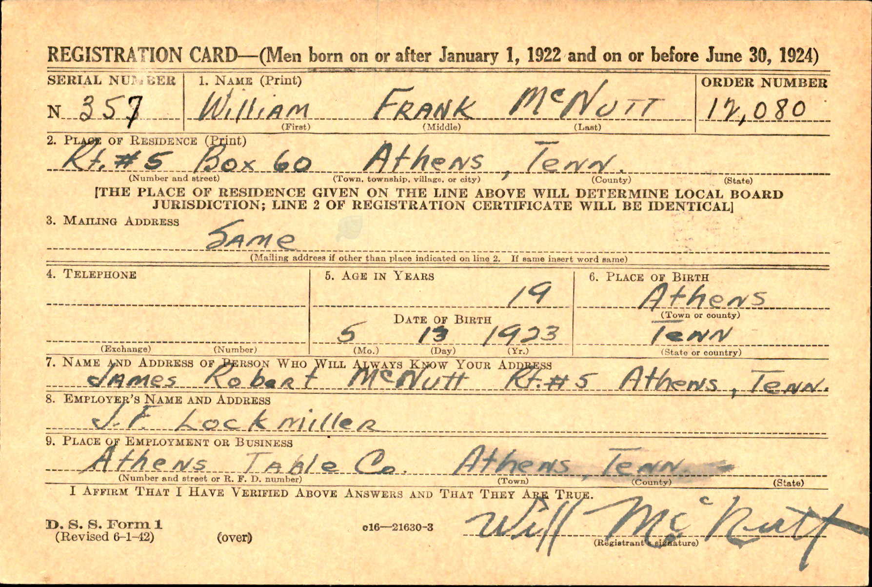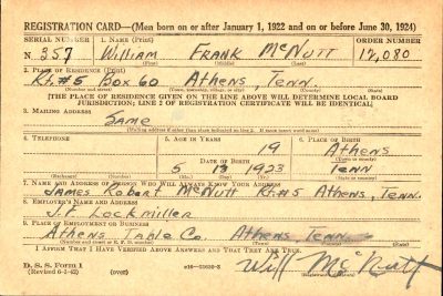 William Frank “Bill” McNutt was born 13 May 1923 in Athens, Tennessee. He was the son of James Roger McNutt and Dessie Allen Mathews.