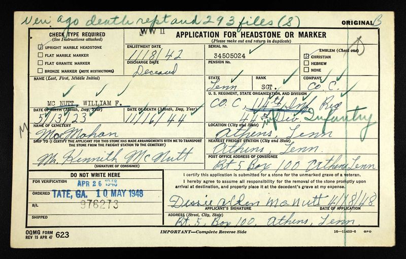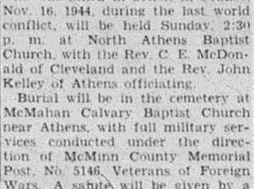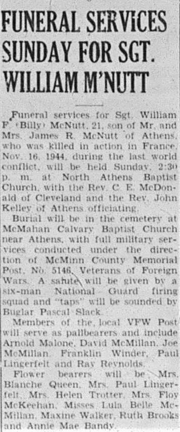 Funeral services for Sgt. William F. (Billy) McNutt, 21, son of Mr. and Mrs. James R. McNutt of Athens, who was killed in action in France Nov. 16, 1944, during the last world conflict, will be held at North Athens Baptist Church. Burial will be in the cemetery at McMahan Calvary Baptist Church near Athens, with full military services conducted under the direction of McMinn County Memorial Post No. , Veterans of Foreign Wars. A salute will be given by a six-man National Guard firing squad and “taps” will be sounded by Buglar Pascal Slack.