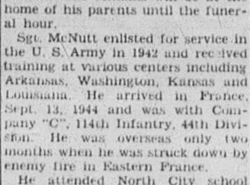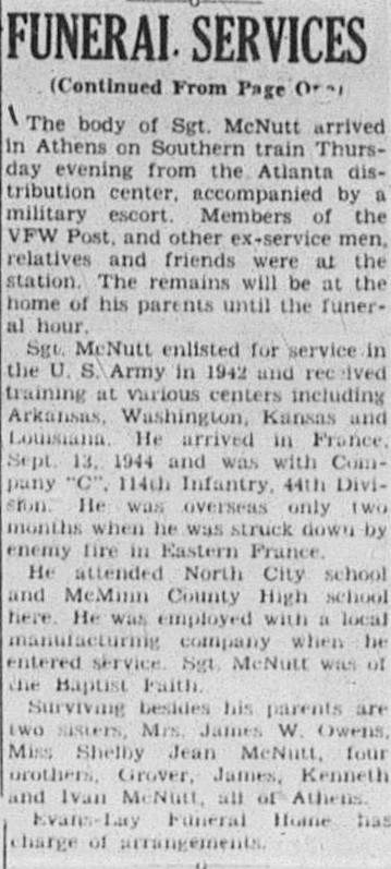 The body of Sgt. McNutt arrived in Athens on Southern train Thursday evening from the Atlanta distribution center, accompanied by a military escort. Members of the VFW Post, and other ex-service men, relatives and friends were at the station. The remains will be at the home of his parents until the funeral hour. Sgt. McNutt enlisted for service in the U.S. Army in 1942 and received training at various centers including Arkansas, Washington, Kansas and Louisiana. He arrived in France, Sept. 13, 1944 and was with Conpany C, 114th Infantry, 44th Division. He was overseas only two months when he was struck down by enemy fire inEastern France. He attended North City school and McMinn County High school here. He was employed with a local manufacturing company when he entered service. Sgt. McNutt was of the Baptist Faith.